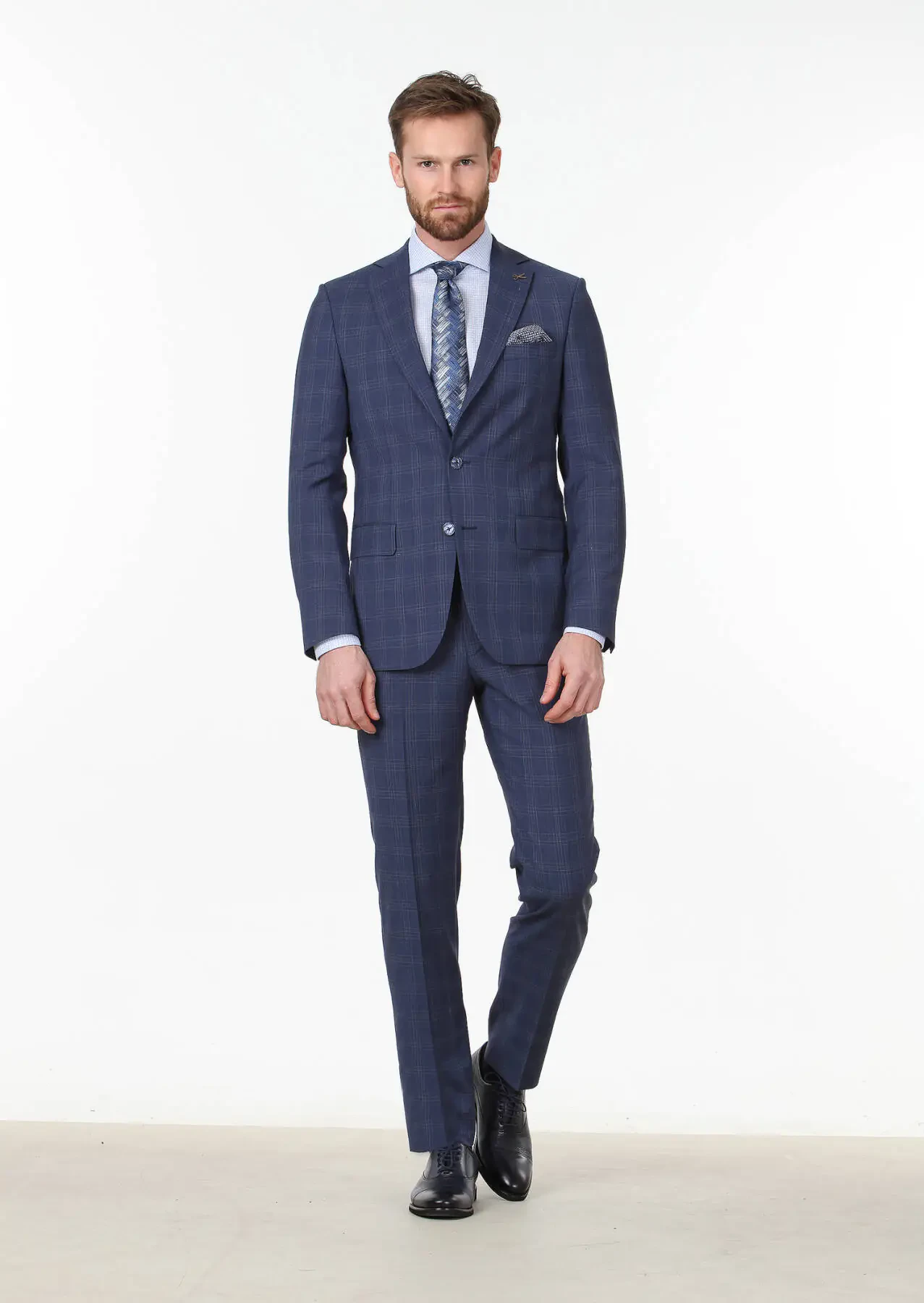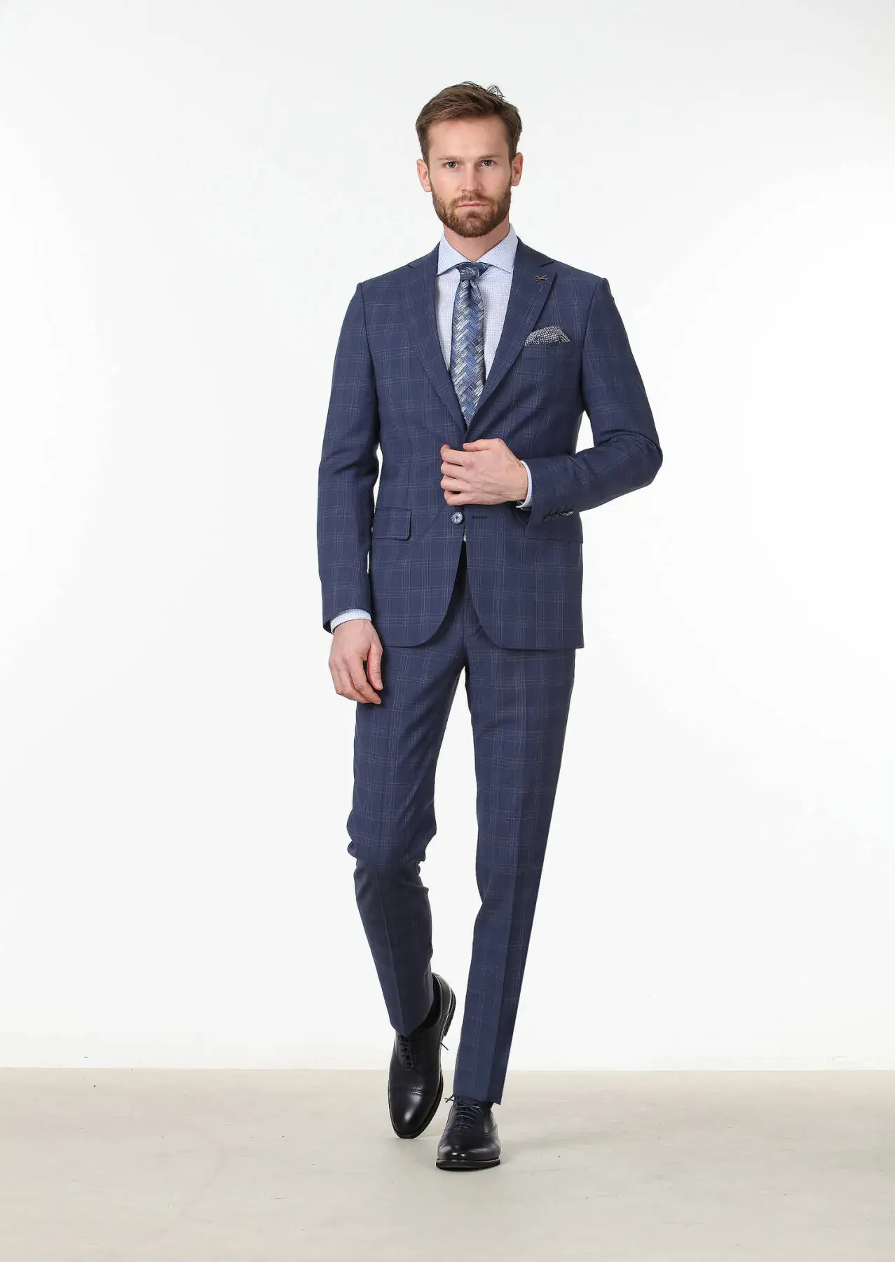 Açık Lacivert Kareli Modern Fit %100 Yün Takım Elbise