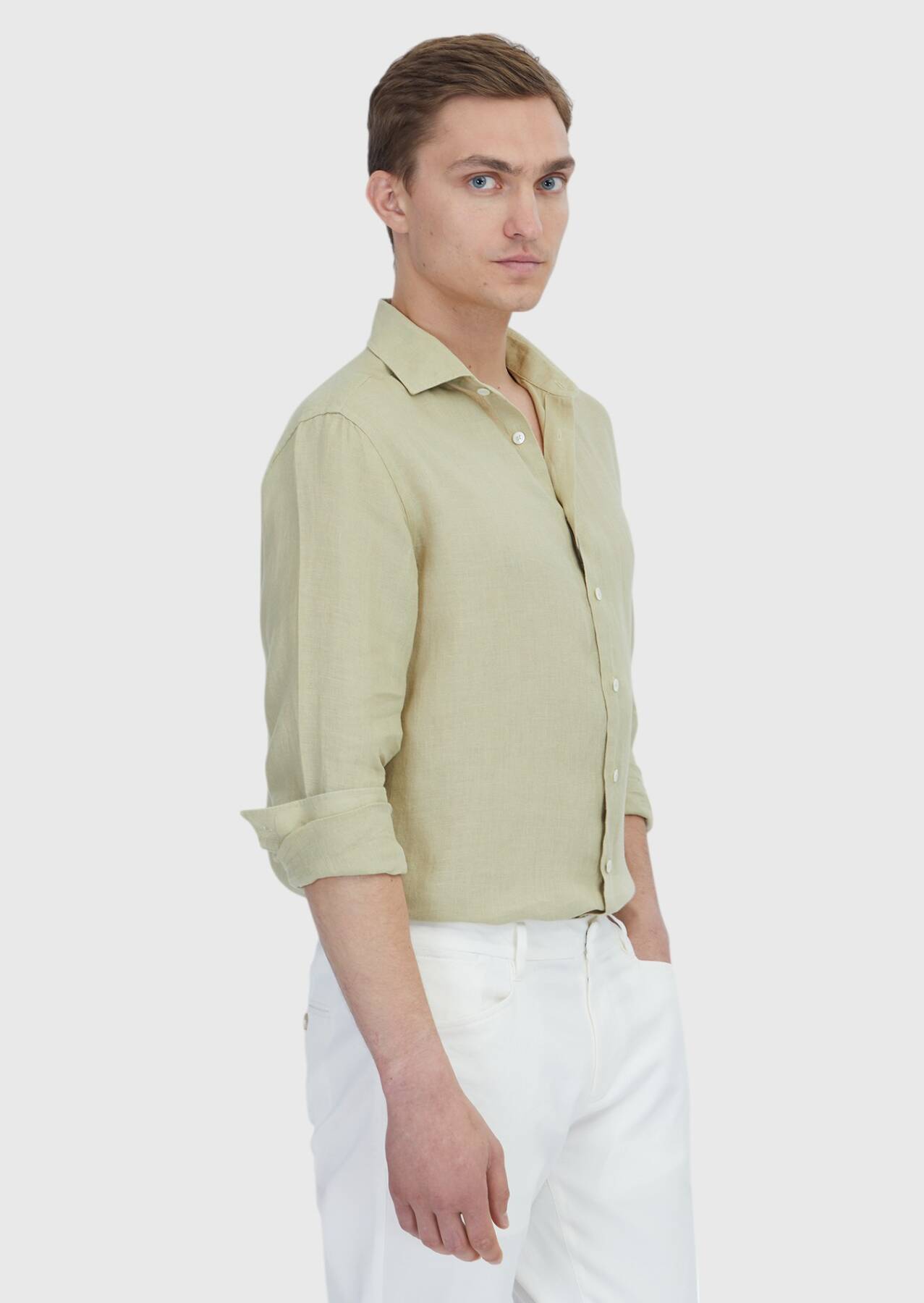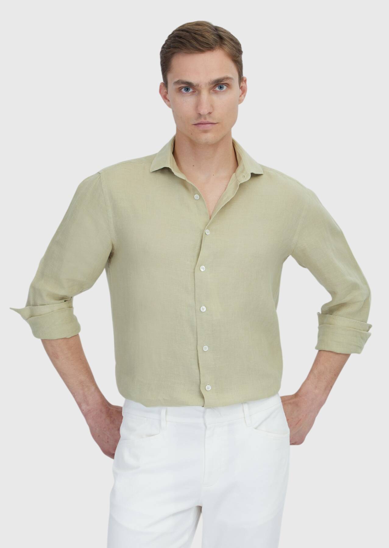 Açık Yeşil Düz Casual Fit Uzun Dokuma Casual %100 Keten Gömlek