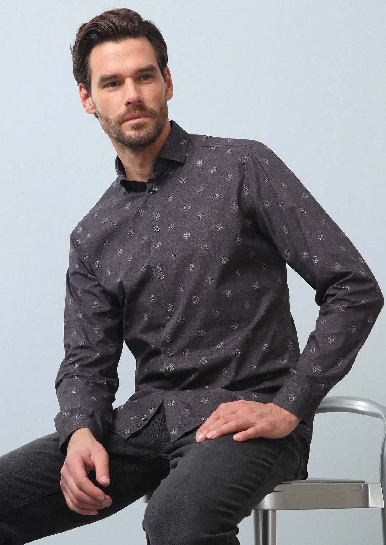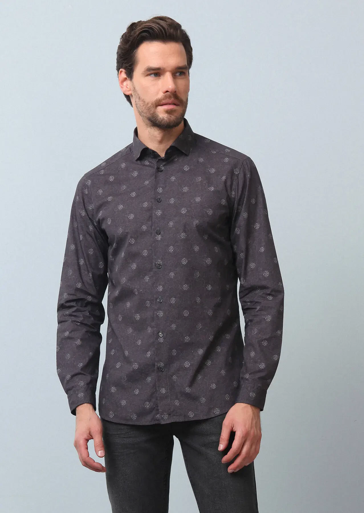 Antrasit Baskılı Slim Fit Dokuma Casual %100 Pamuk Gömlek