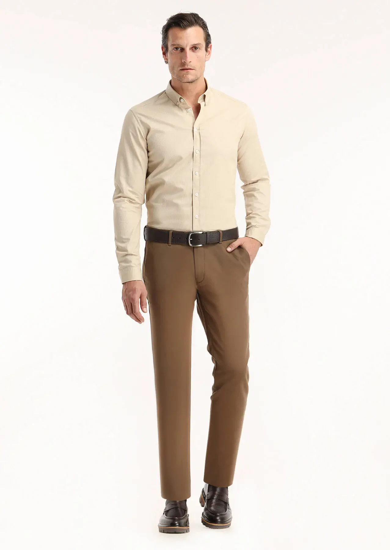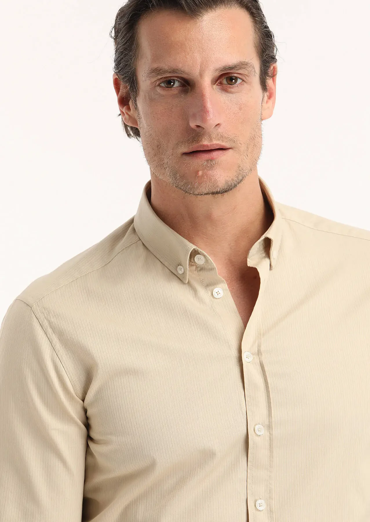 Beige Ribbed Regular Fit Weaving Casual 100% Cotton Shirt