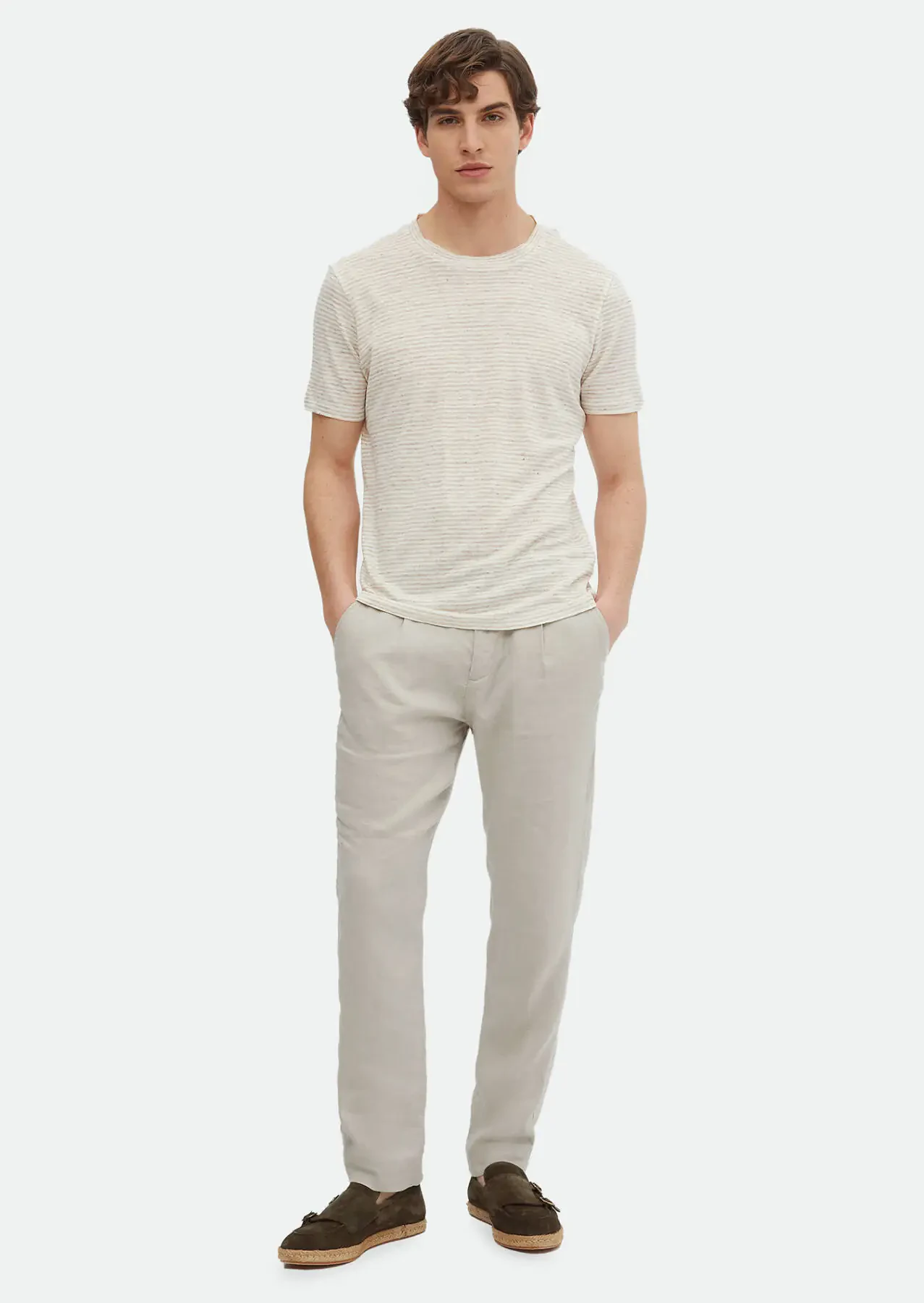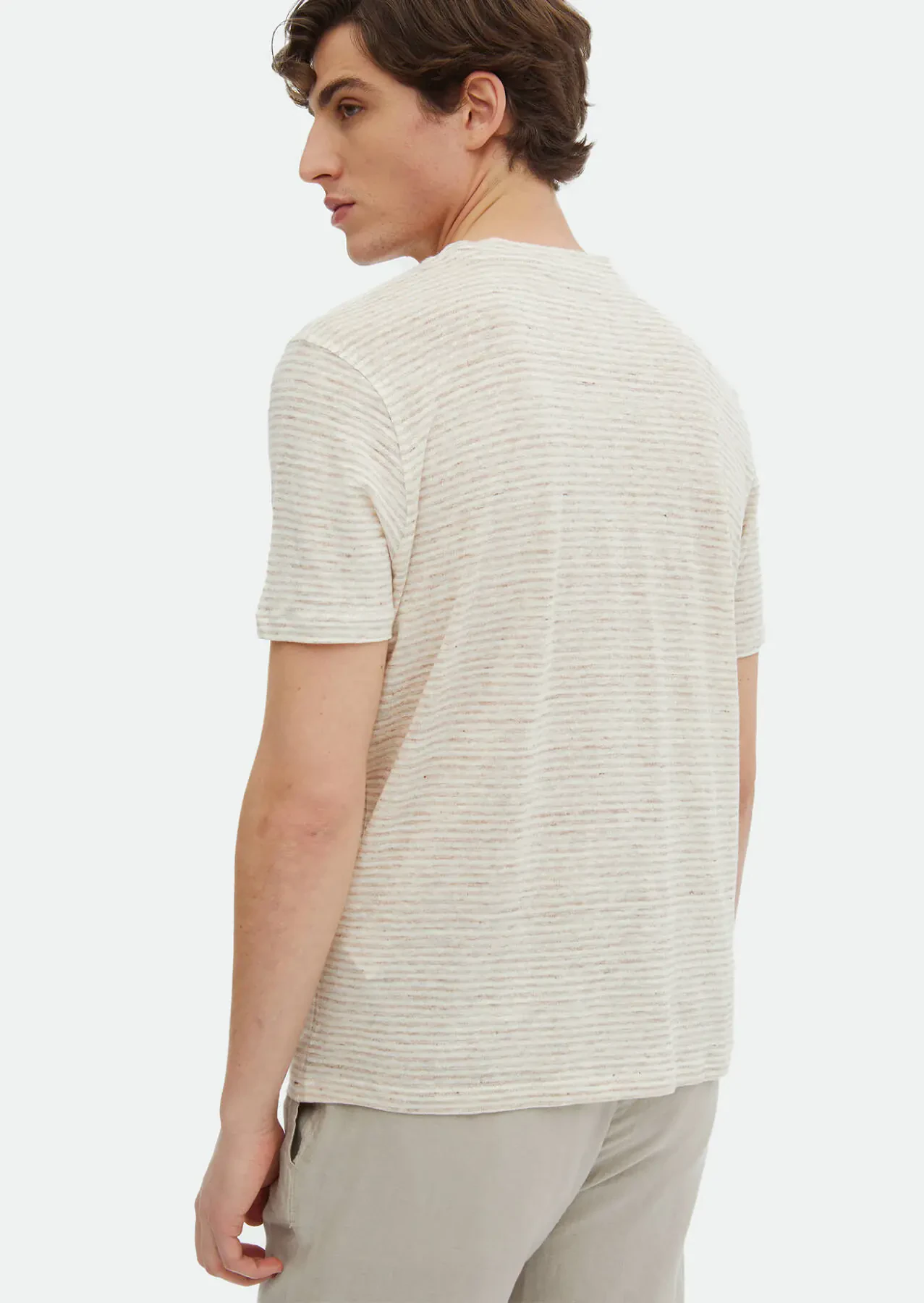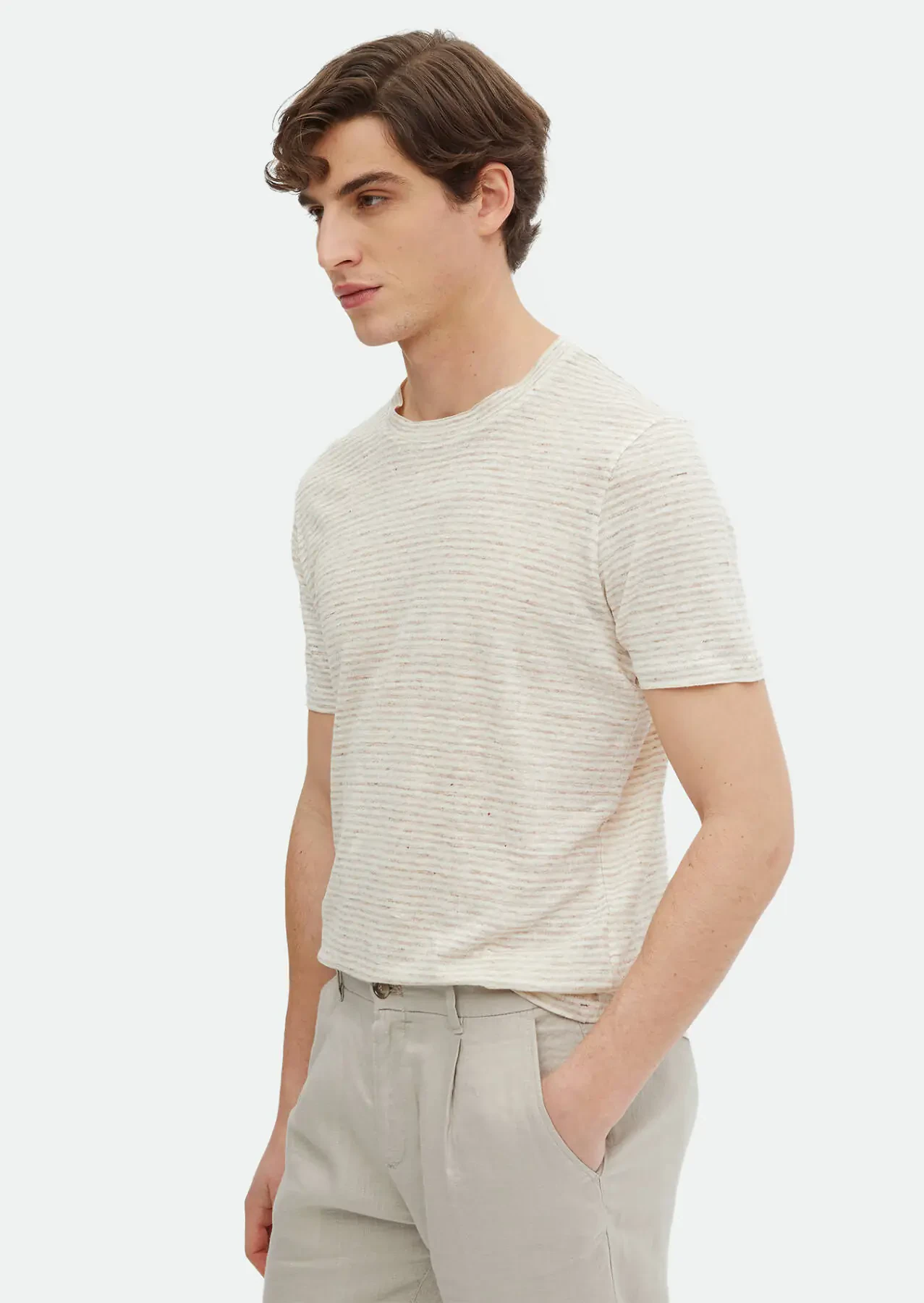 Bej Çizgili Bisiklet Yaka %100 Keten T-Shirt
