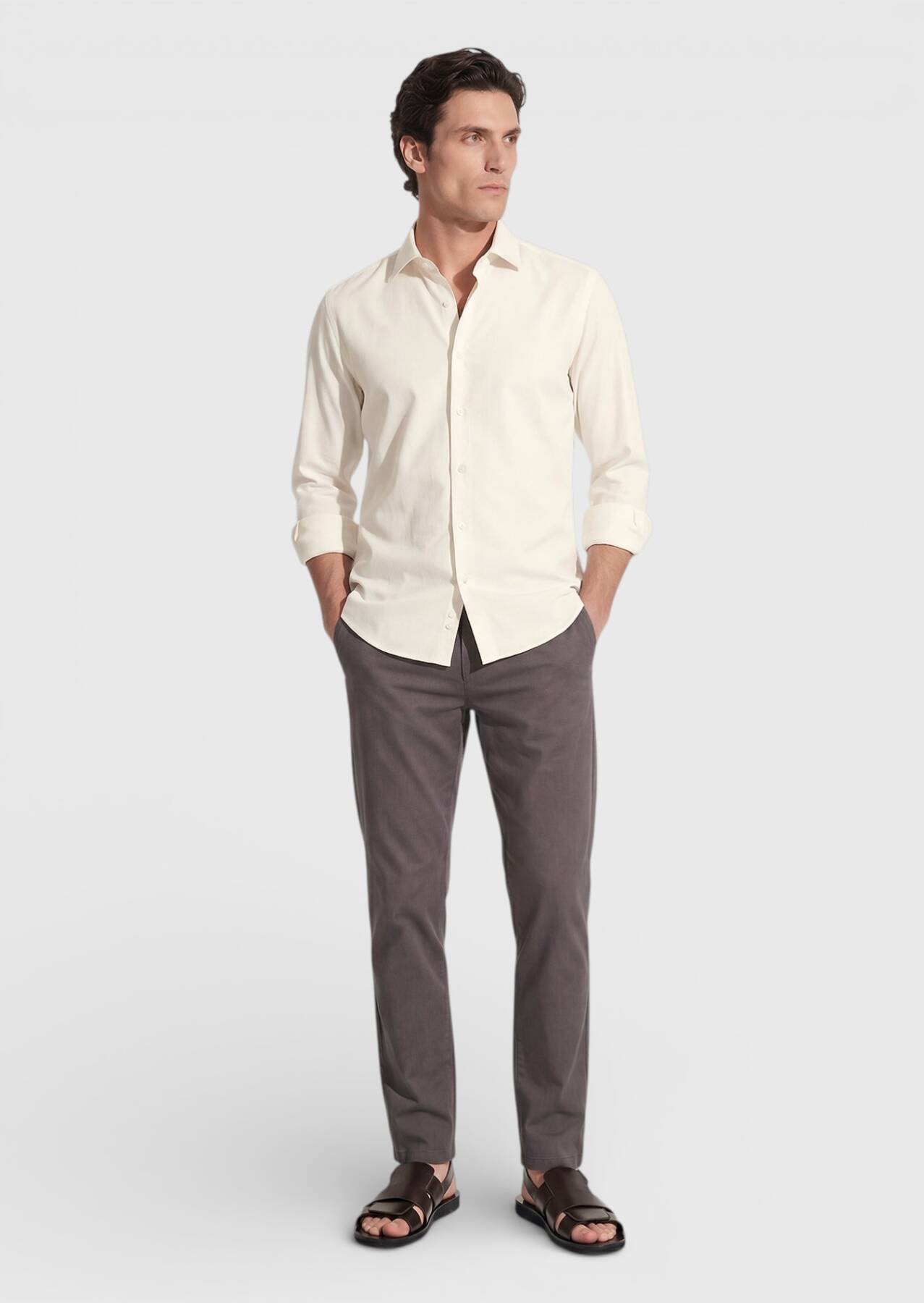 Bej Düz Casual Fit Dokuma Casual %100 Pamuk Gömlek