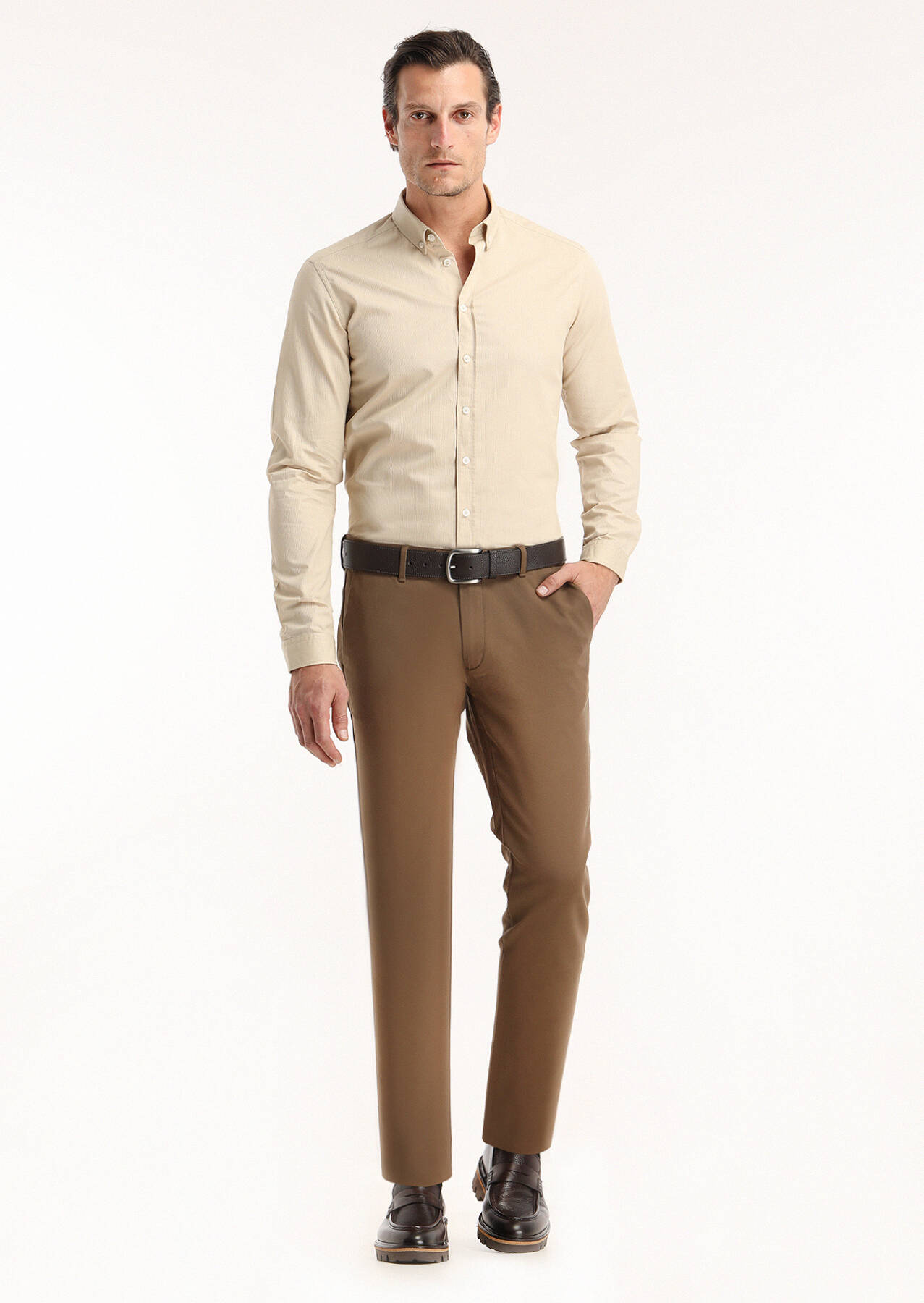 Bej Fitilli Regular Fit Uzun Dokuma Casual %100 Pamuk Gömlek