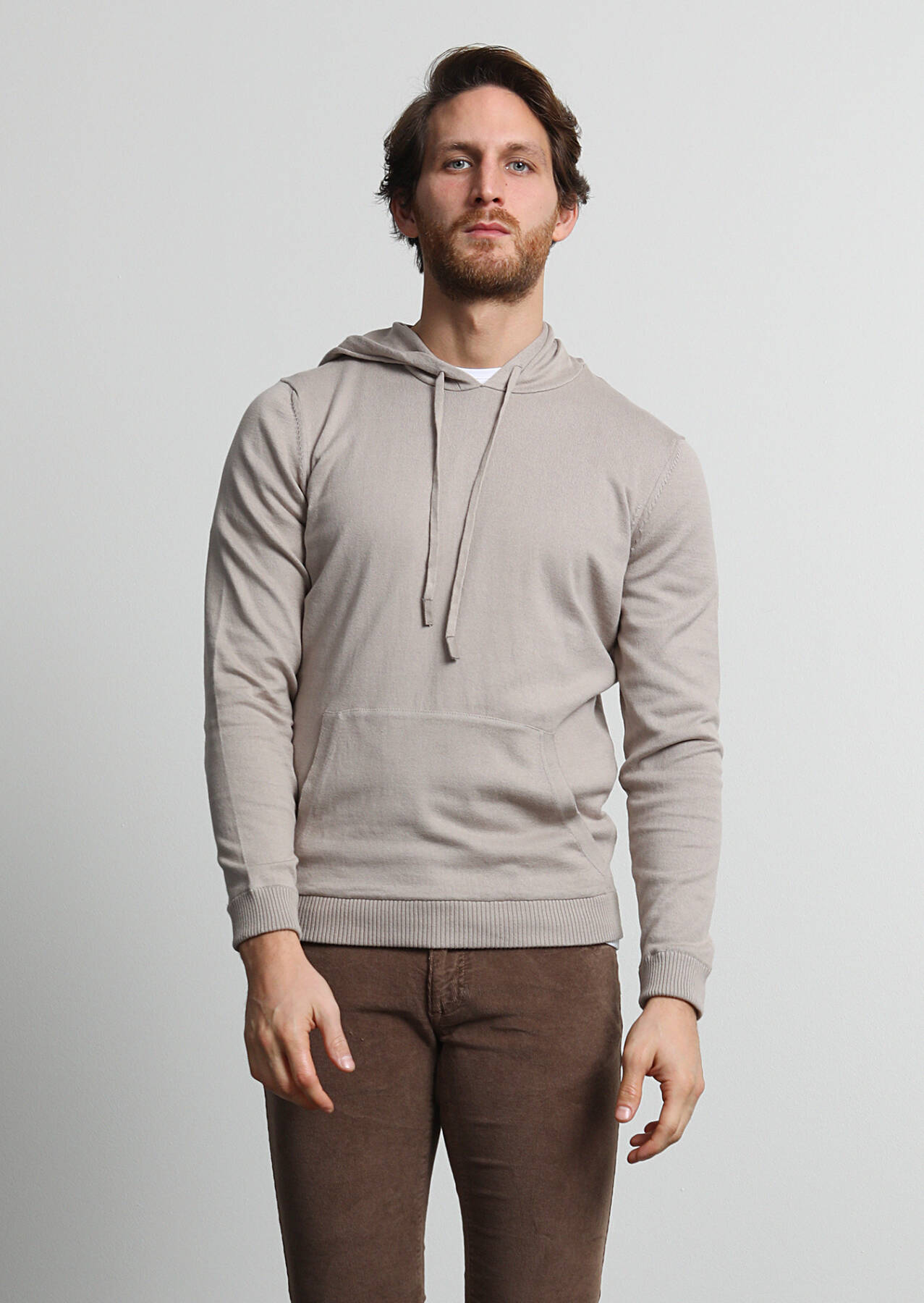 Bej Kapüşonlu Düz Örgü %100 Pamuk Triko Kazak