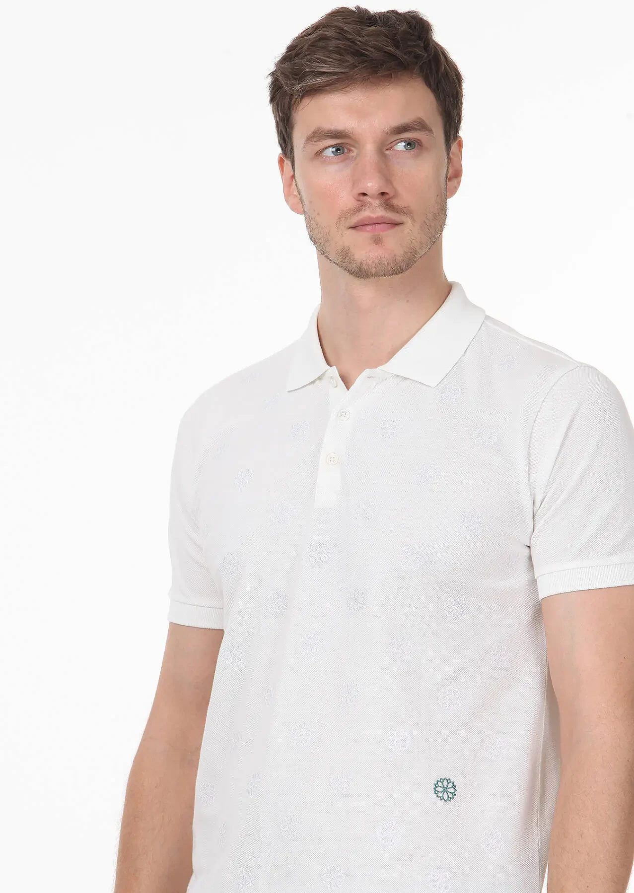Beyaz Desenli Polo Yaka %100 Pamuk T-Shirt