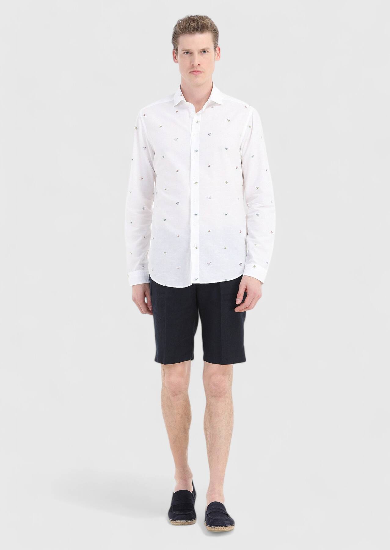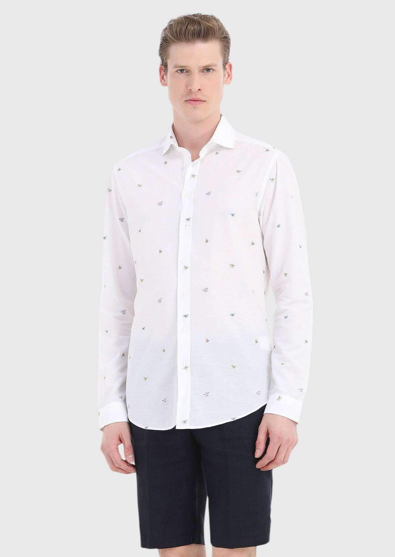 Beyaz Desenli Regular Fit Uzun Dokuma Casual Pamuk Karışımlı Gömlek