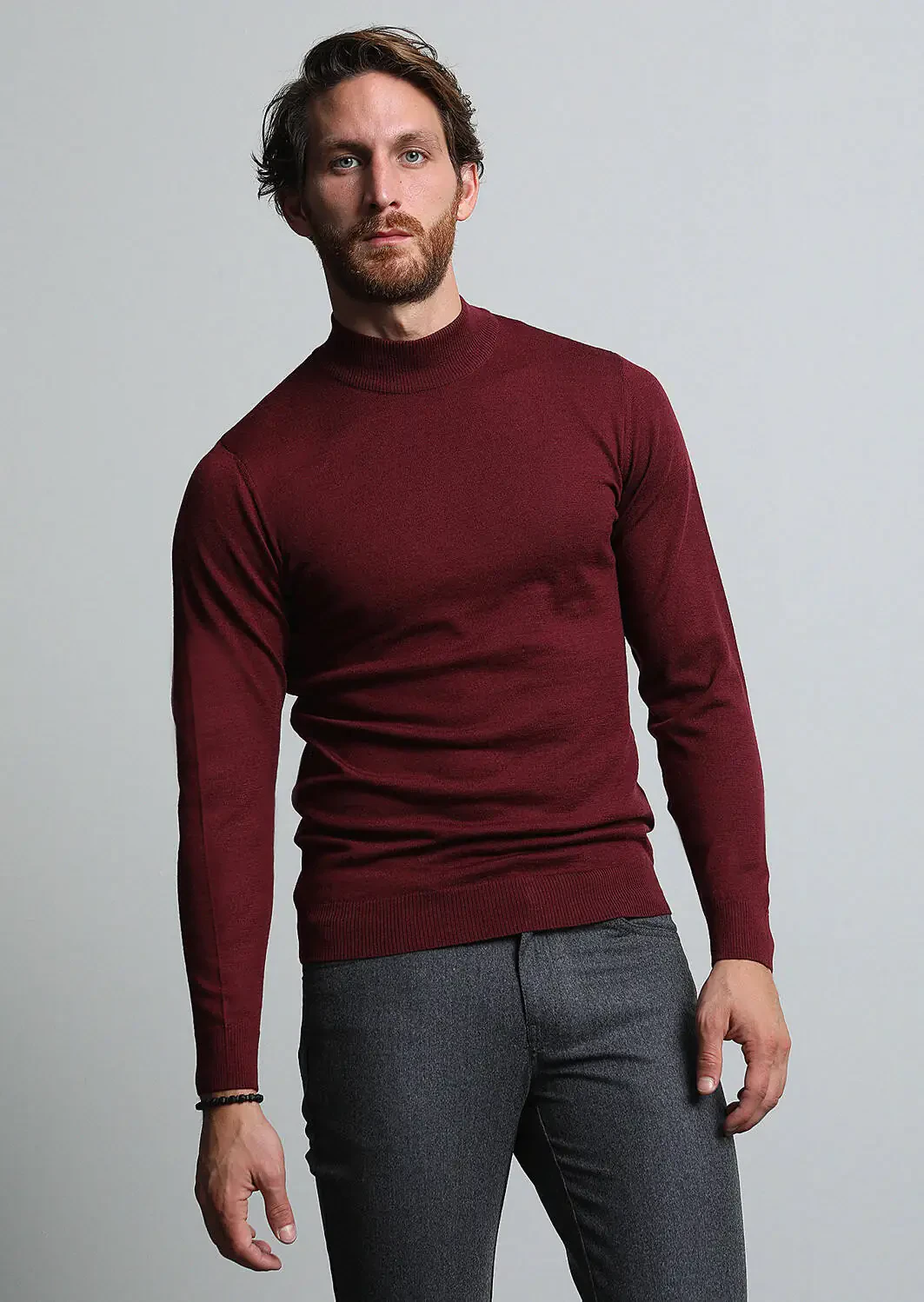 Bordo Yarım Balıkçı Yaka Jakarlı %100 Yün Triko Kazak