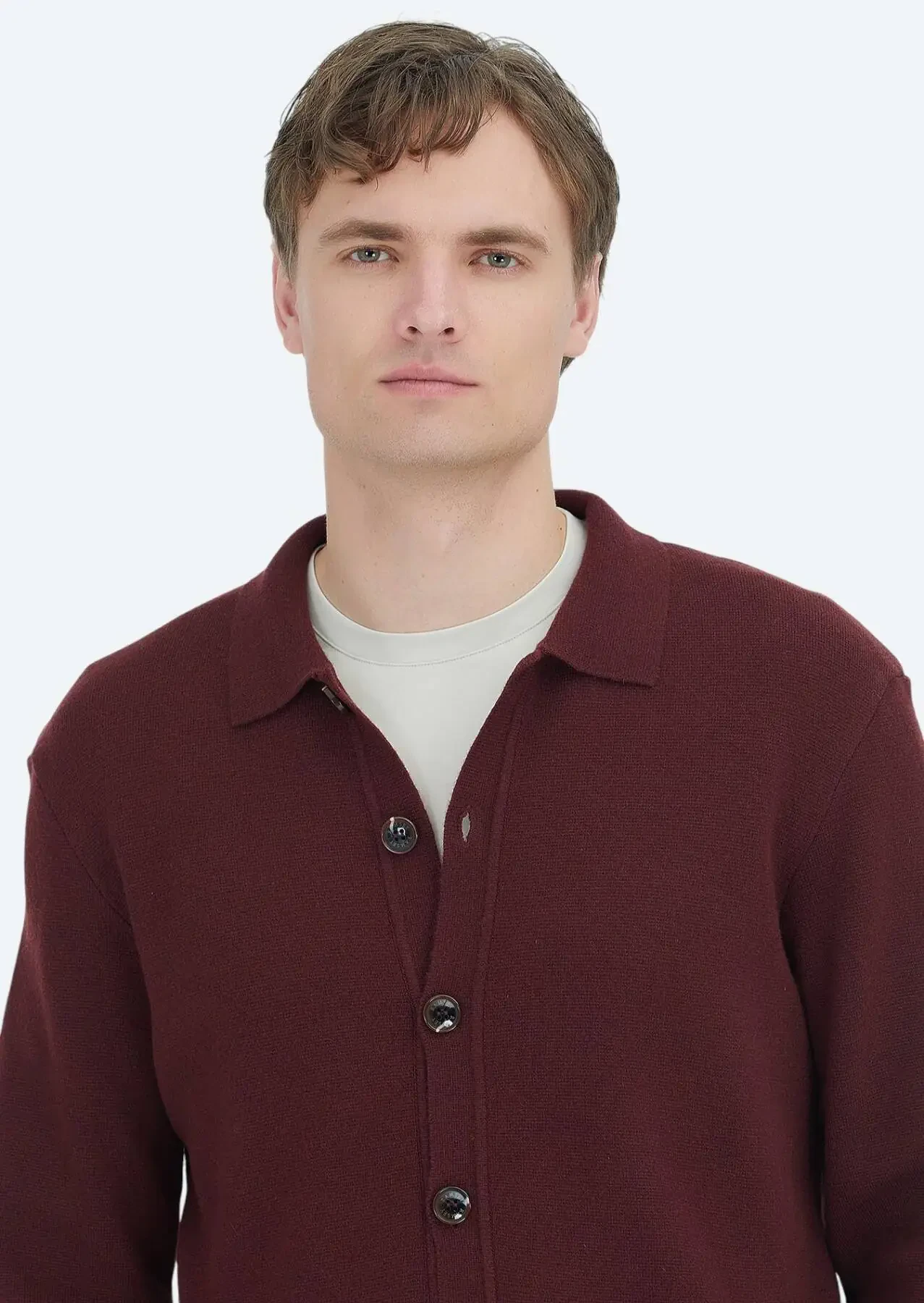 Burgundy Polo Neck Plain Knitting Wool Blended Cardigan