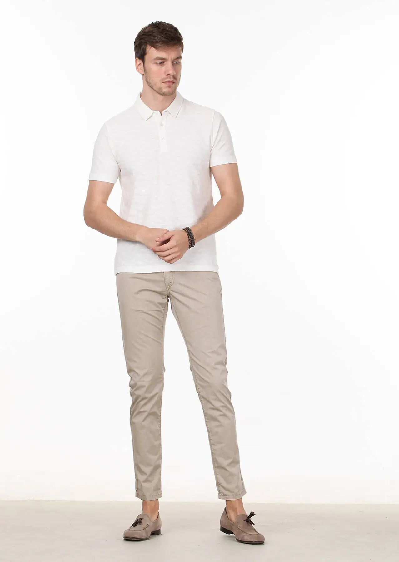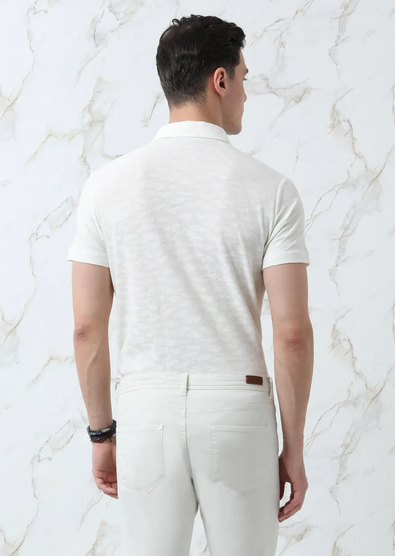 Ecru Jacquard Polo Neck 100% Cotton T-Shirt