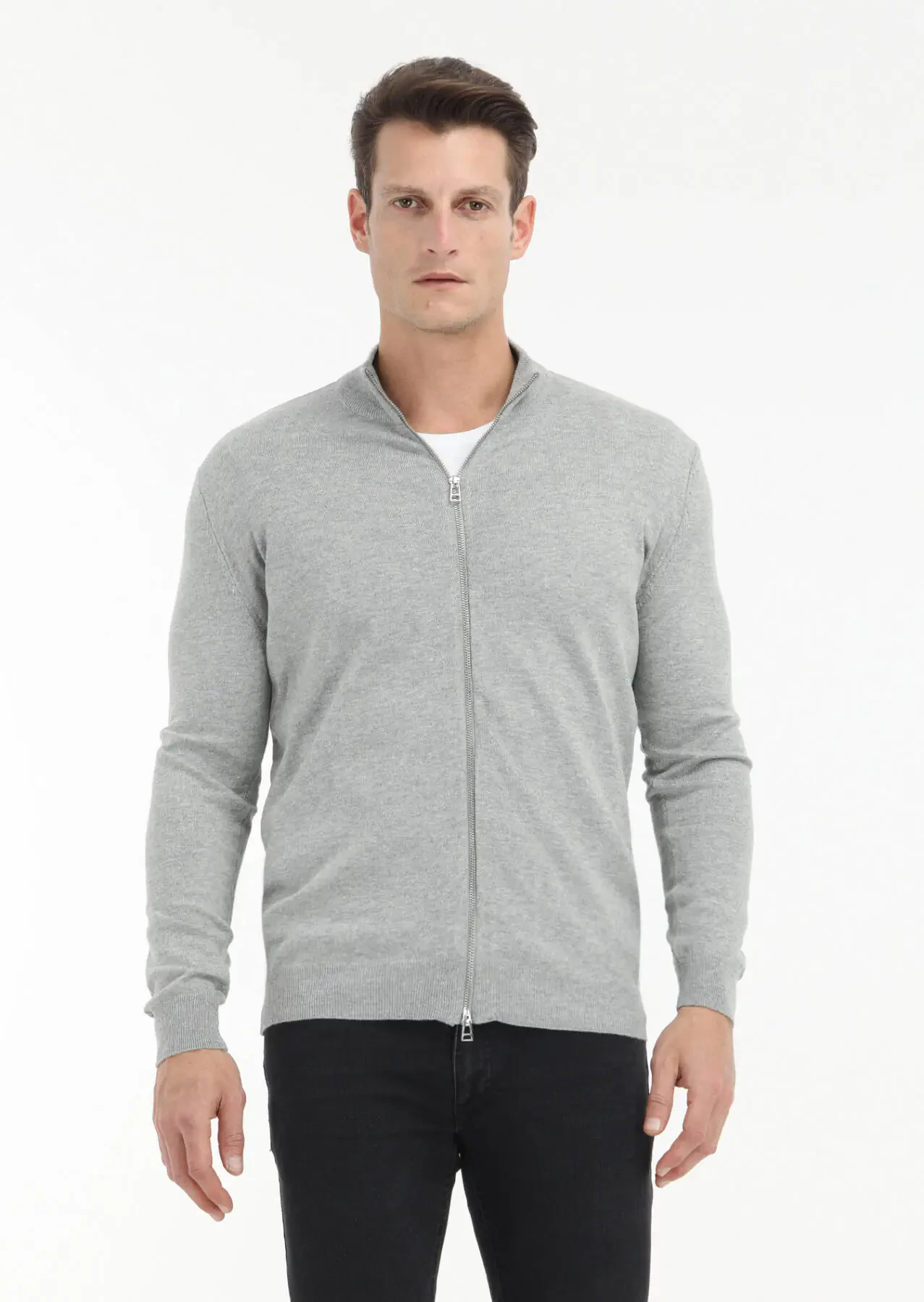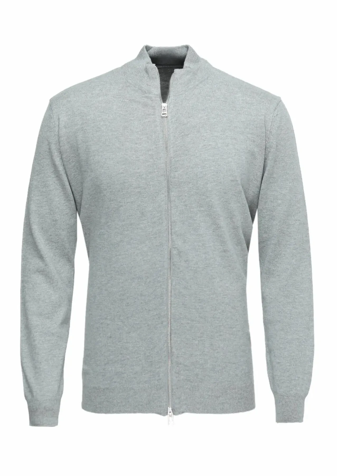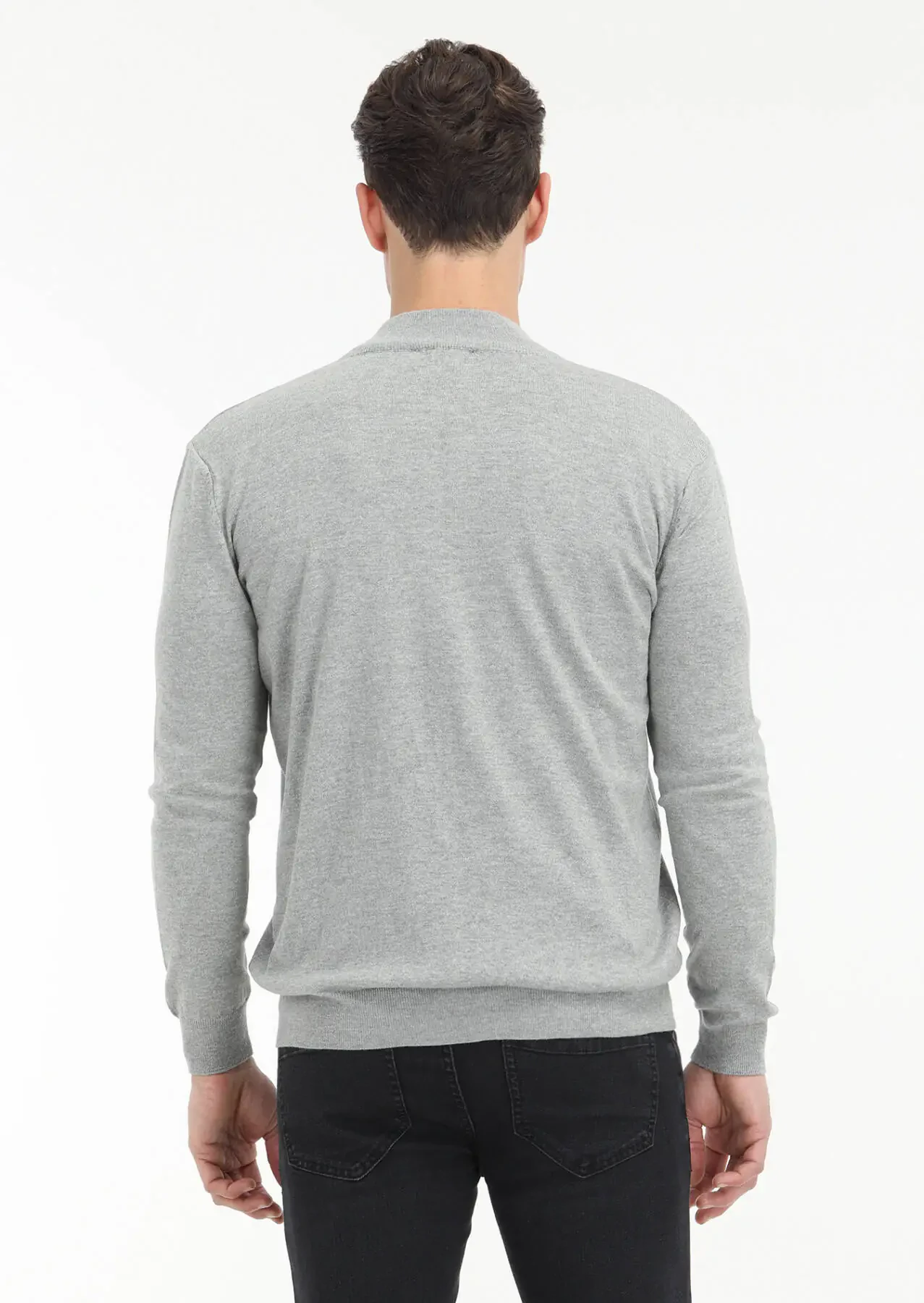 Grey Mock-Turtleneck Plain Knitting Wool Blended Cardigan