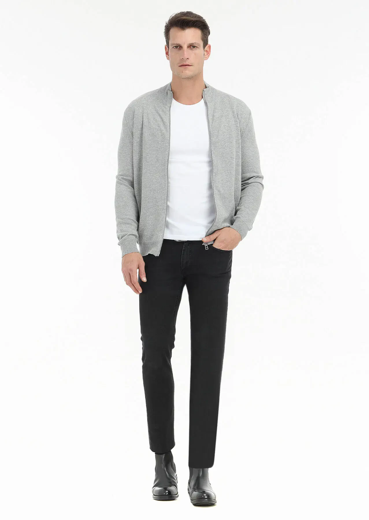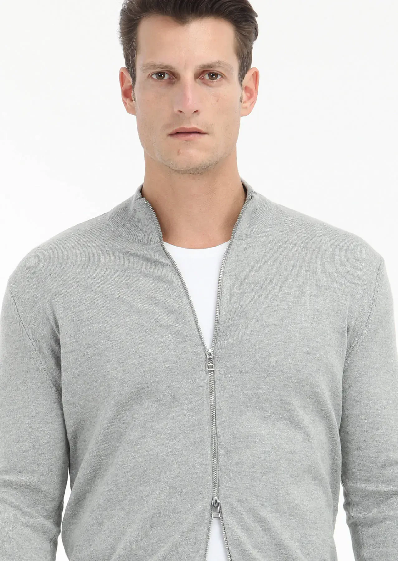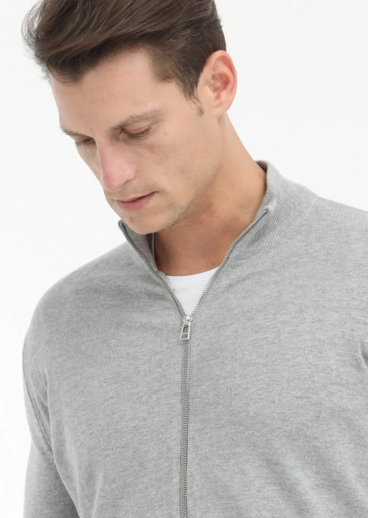 Grey Mock-Turtleneck Plain Knitting Wool Blended Cardigan