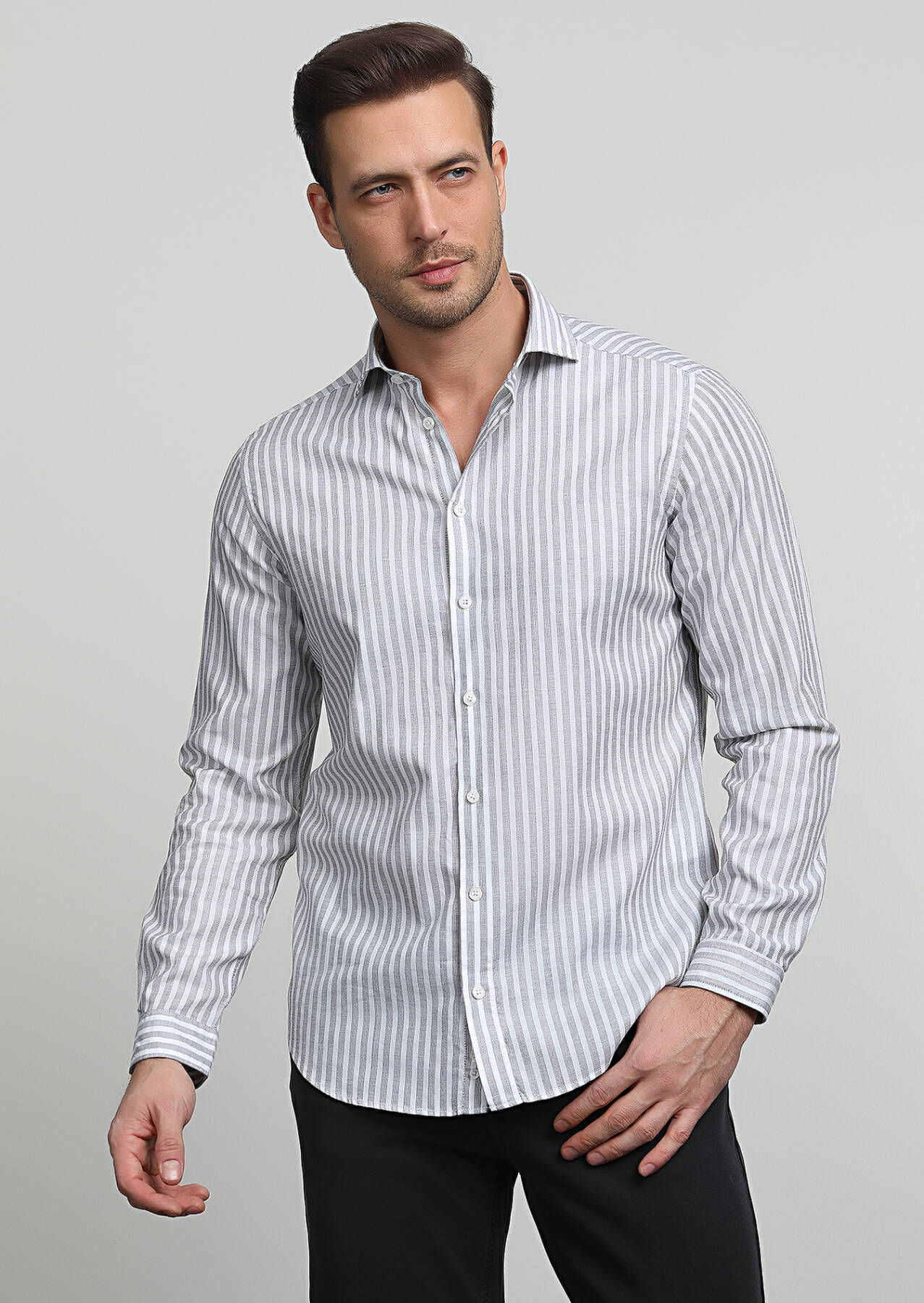 Gri Çizgili Regular Fit Uzun Dokuma Casual %100 Pamuk Gömlek