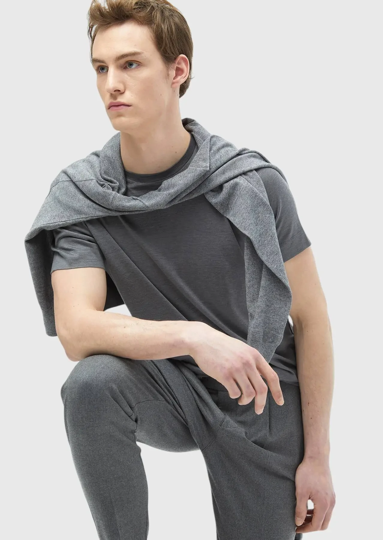 Gri Düz Bisiklet Yaka İpek Karışımlı T-Shirt