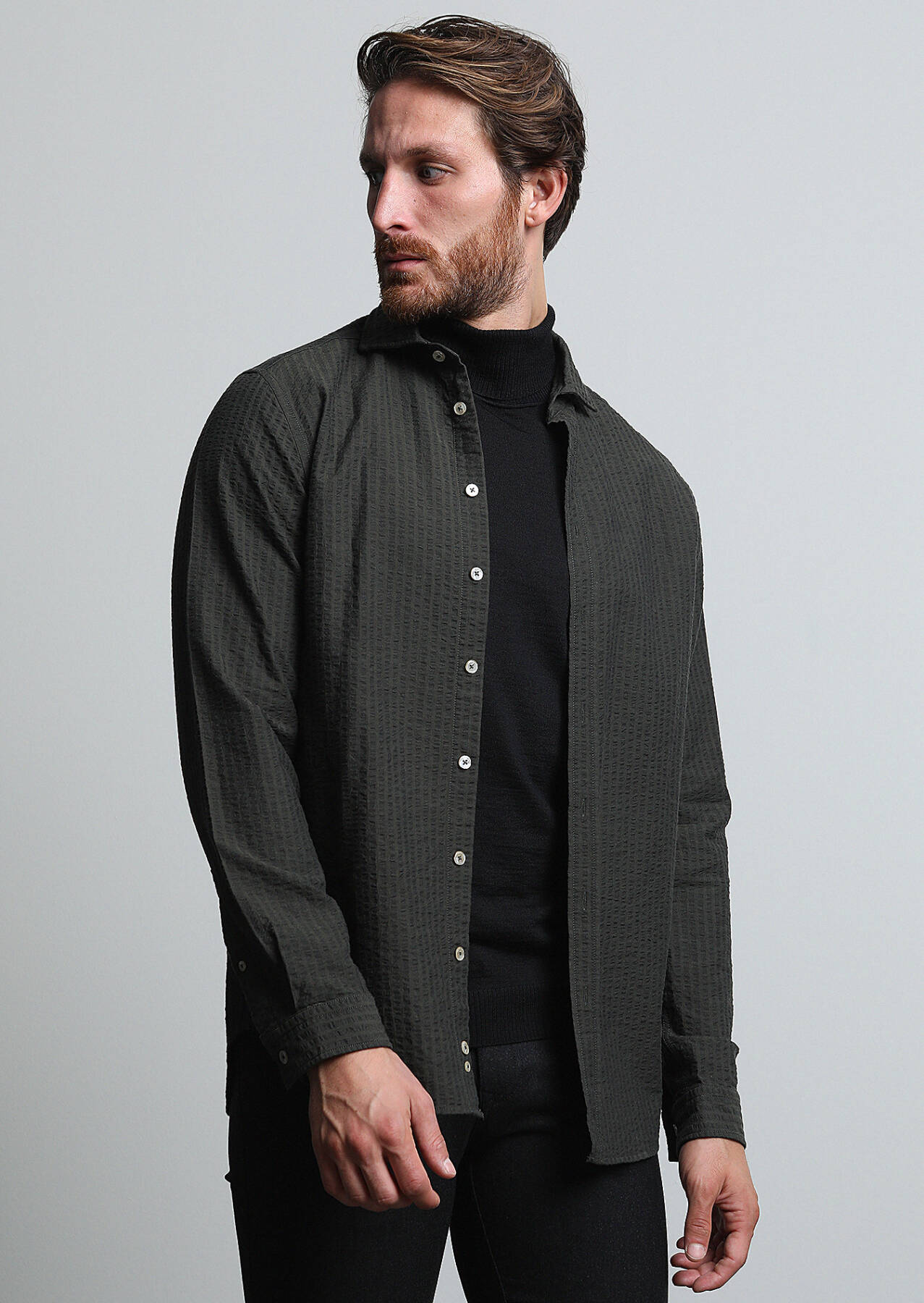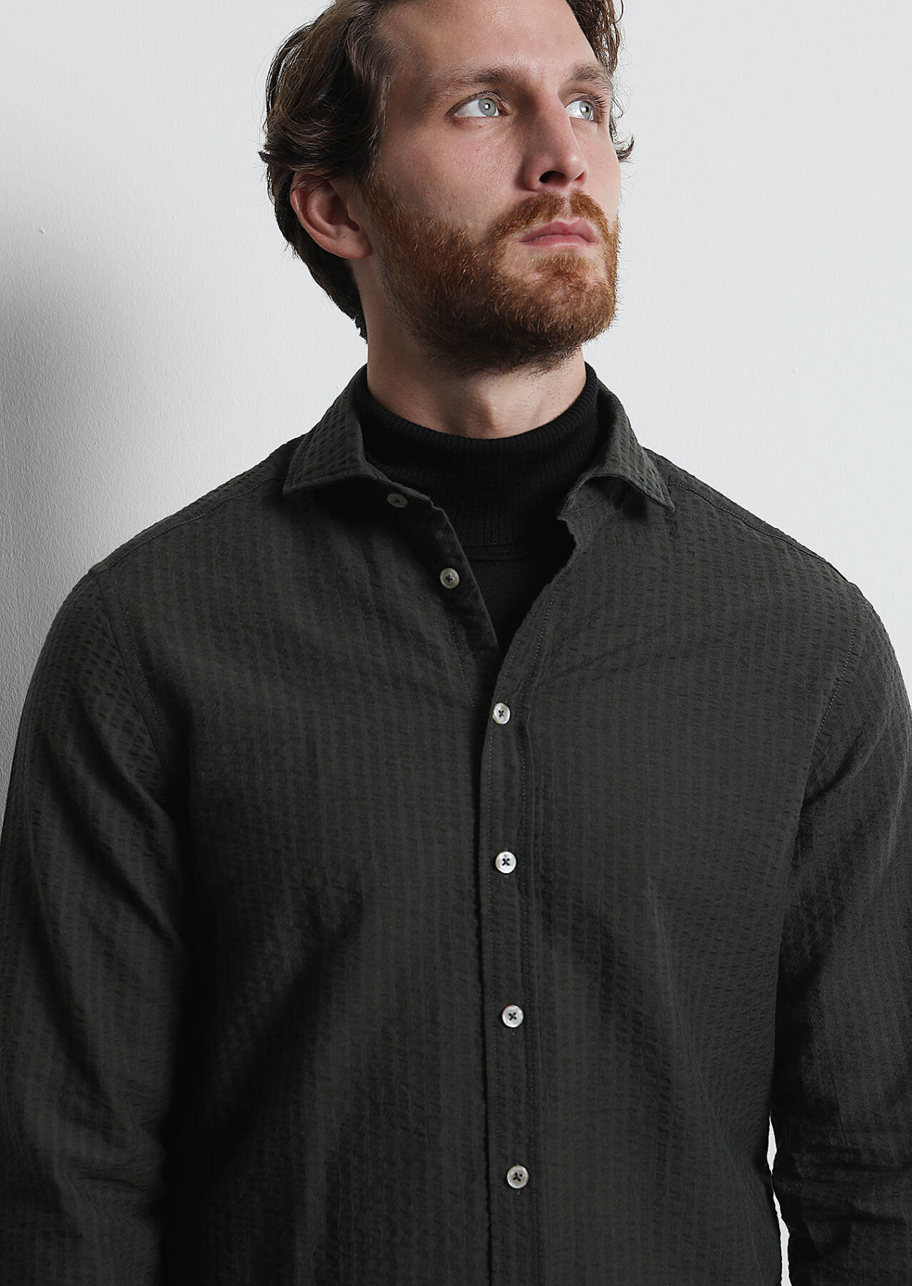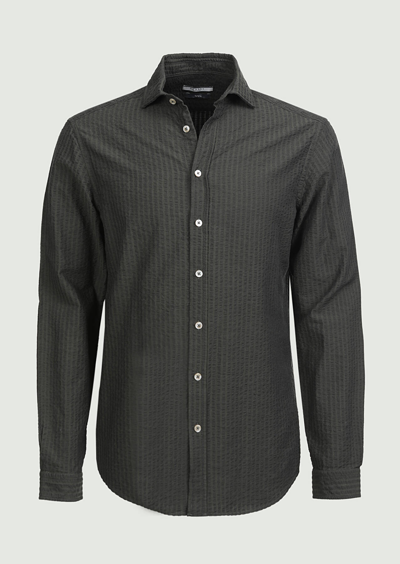 Haki Çizgili Regular Fit Uzun Dokuma Casual %100 Pamuk Gömlek