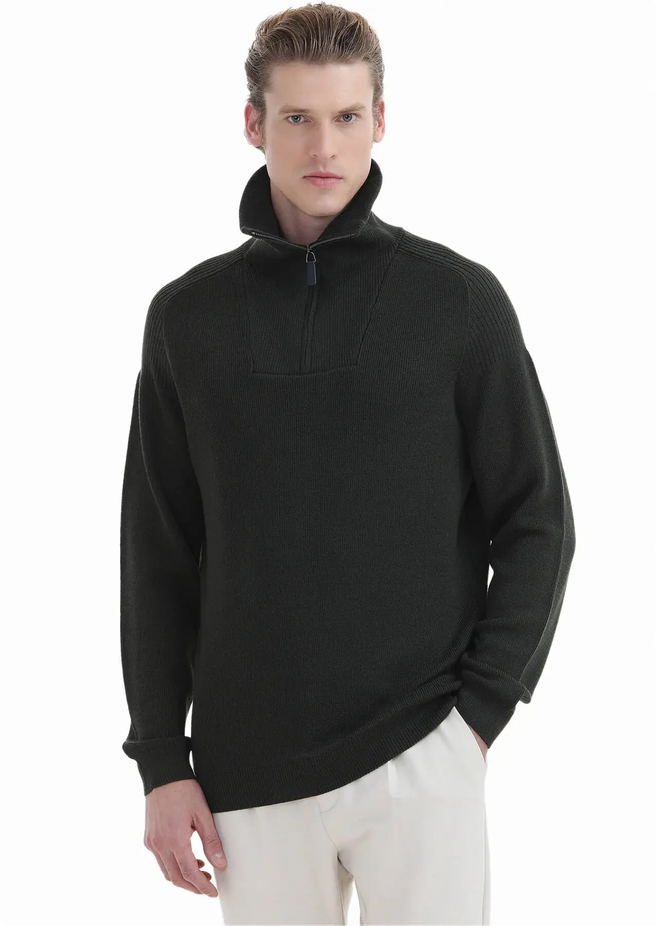 Haki Yarım Balıkçı Yaka Jakarlı Yün Karışımlı Triko Kazak