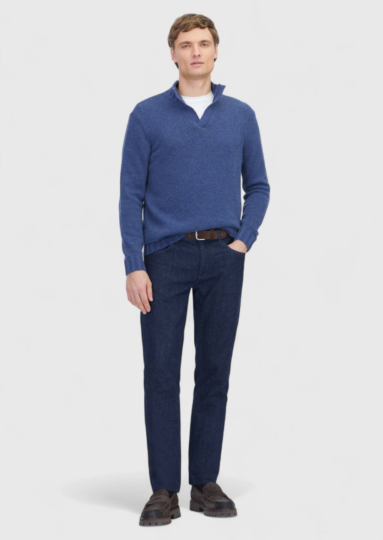 Özel olarak elde edilen geri dönüşümlü yün ve kaşmirden üretilmiştir. V detaylı yarım balıkçı yakaya sahiptir. Rahat kalıbı kendinden desenli detayları şık bir dokunuş katar.