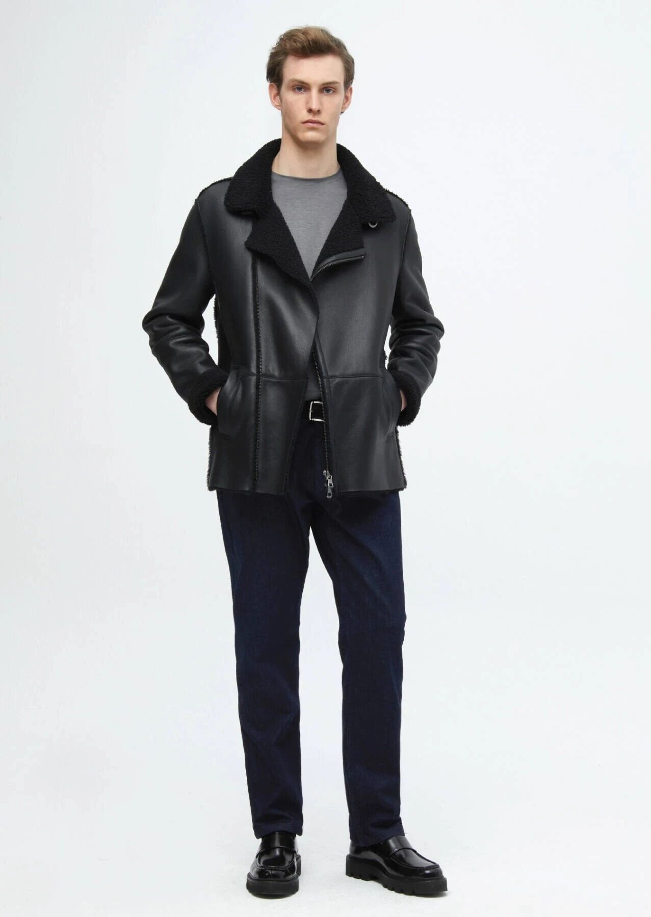 Siyah Regular Fit Gömlek Yaka Casual Kürk Deri Mont