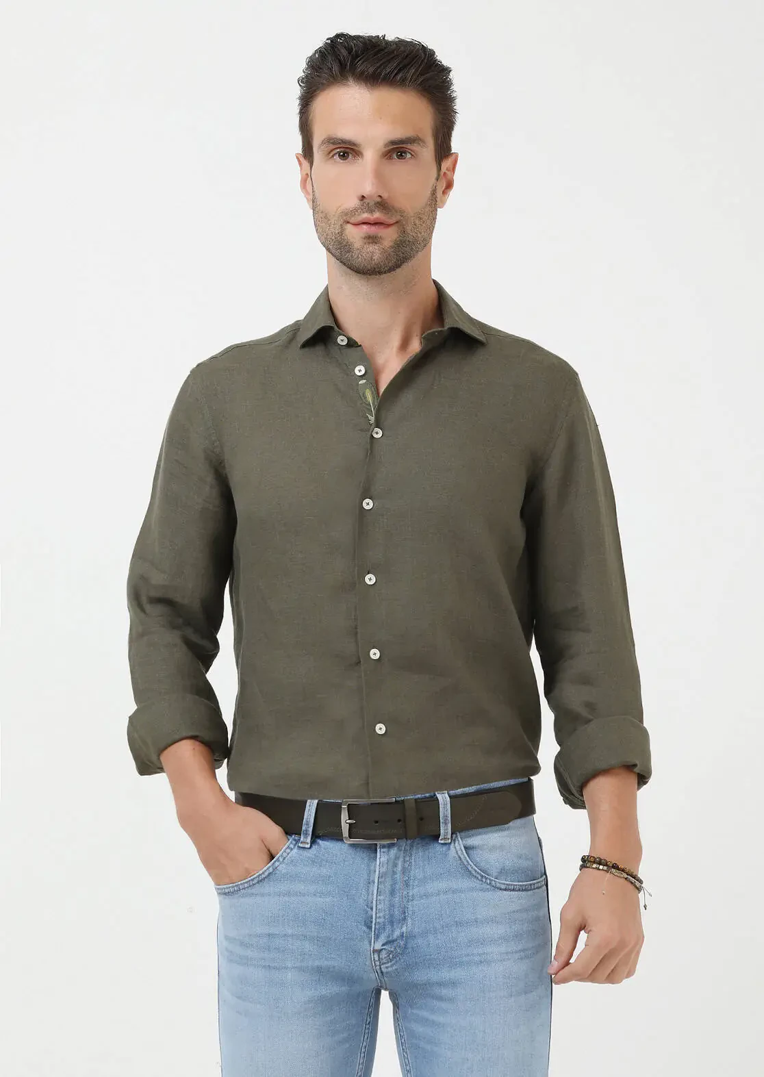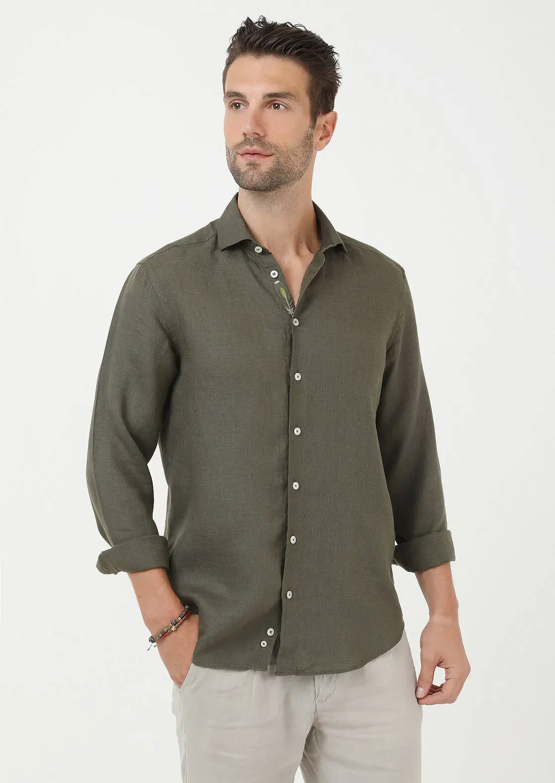 Khaki Plain Regular Fit Weaving Casual 100% Linen Shirt