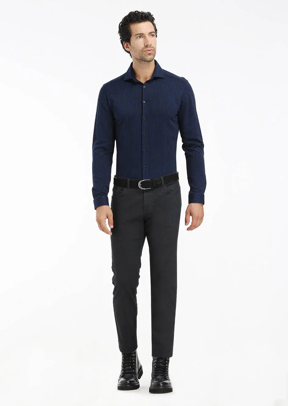 Lacivert Çizgili Slim Fit Casual %100 Pamuk Gömlek