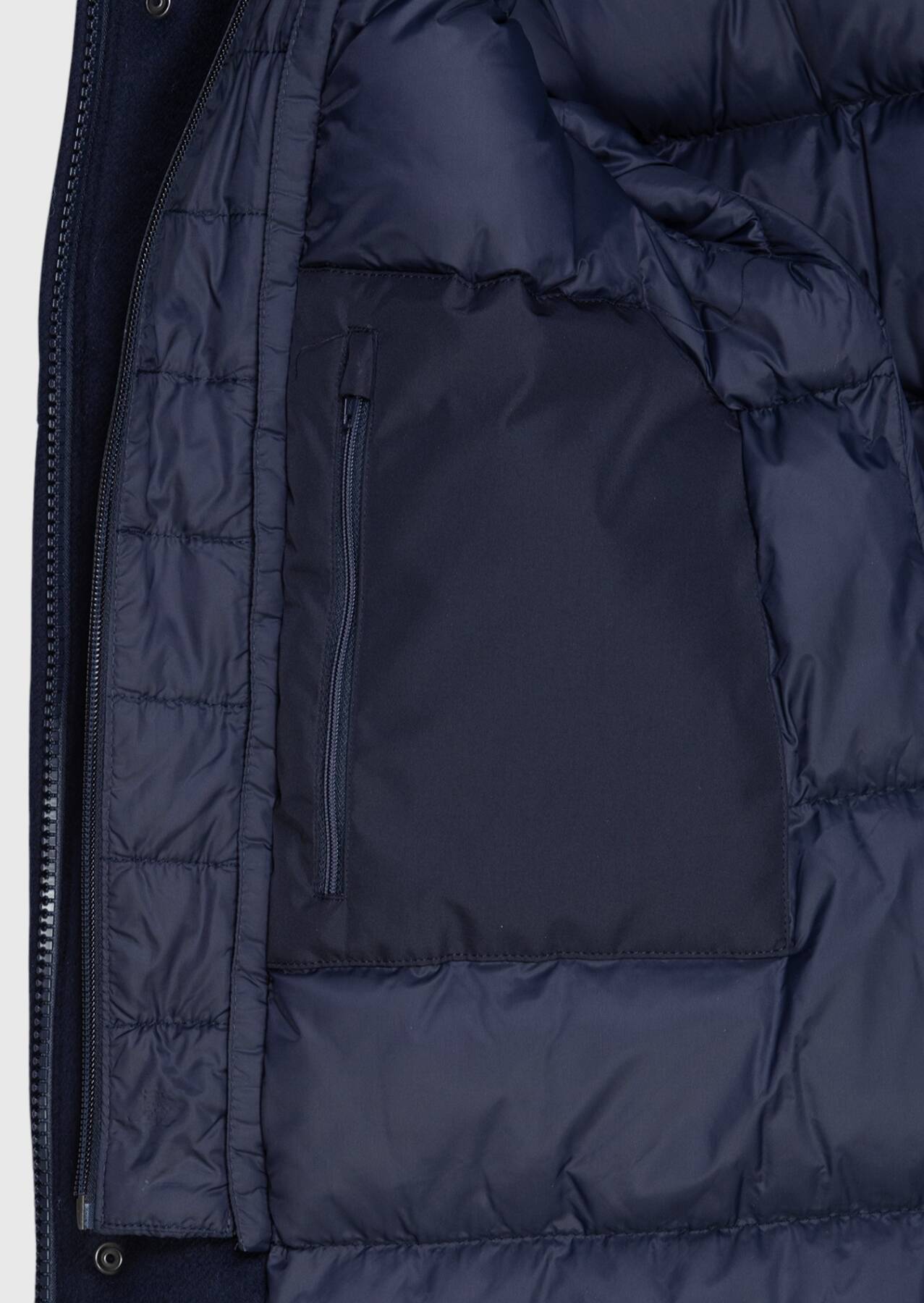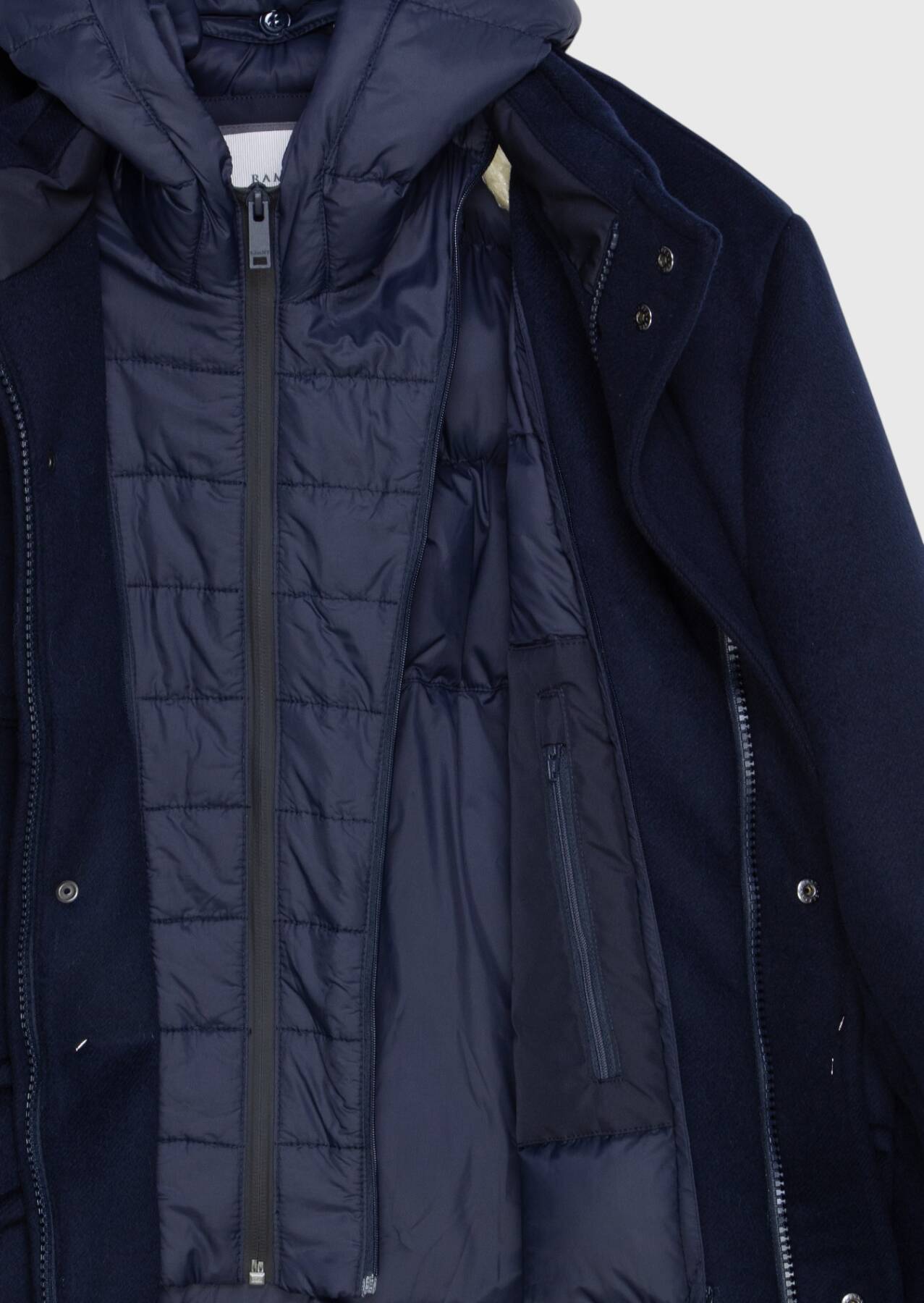 Ramsey'in lacivert kapüşonlu yünlü kabanıyla şehirli stilinizi bir üst seviyeye taşıyın. Klasik yün dokusu, modern puffer detaylar ve fonksiyonel iç yeleğiyle hem şık hem de güvendesiniz. Çizgili slim fit pantolon, yarım fermuarlı triko ve Oxford ayakkabılarla kombinleyerek Ramsey şıklığını tamamlayın.