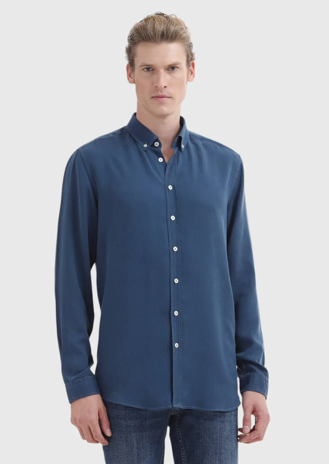 Light Petrol Blue Plain Regular Fit Weaving Casual Shirt