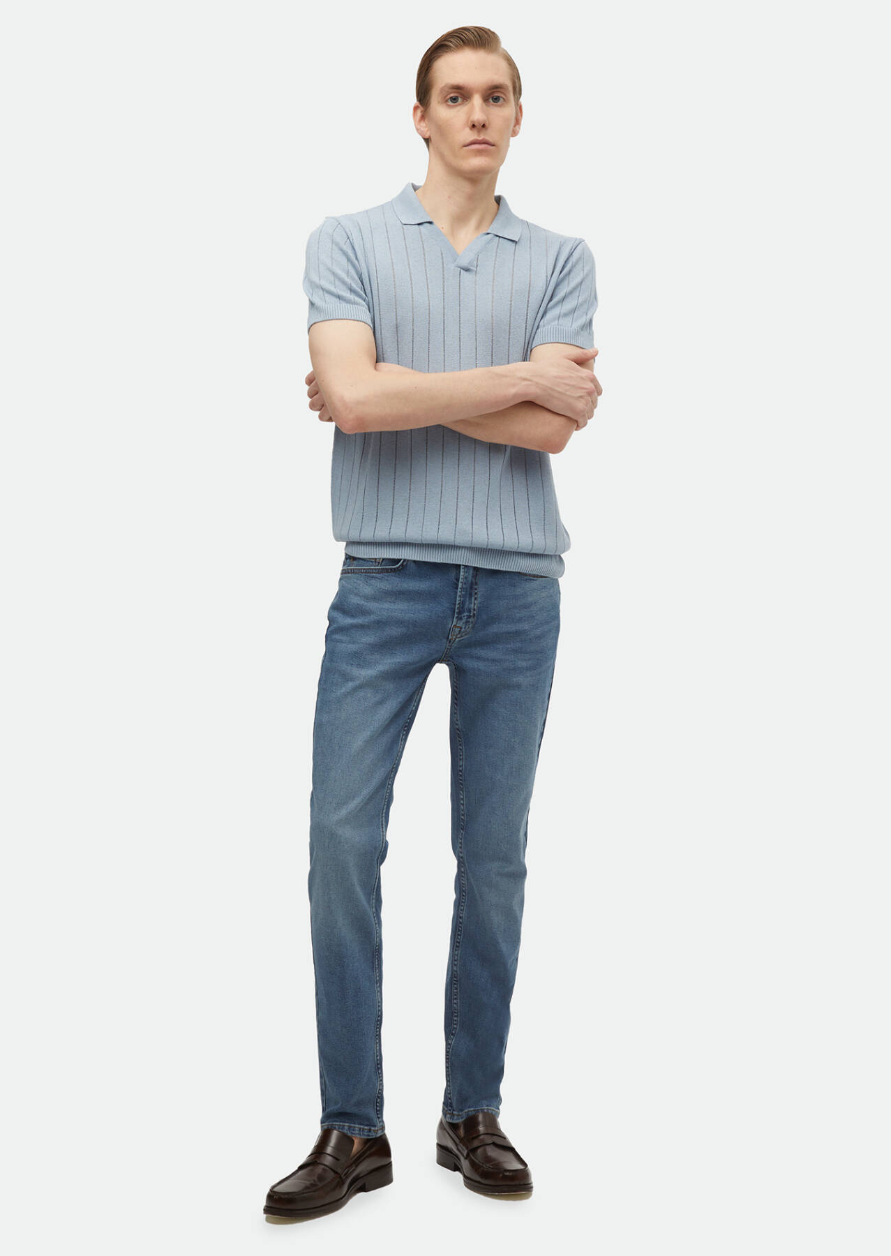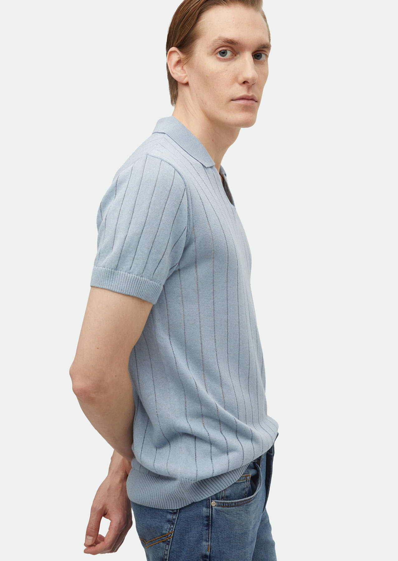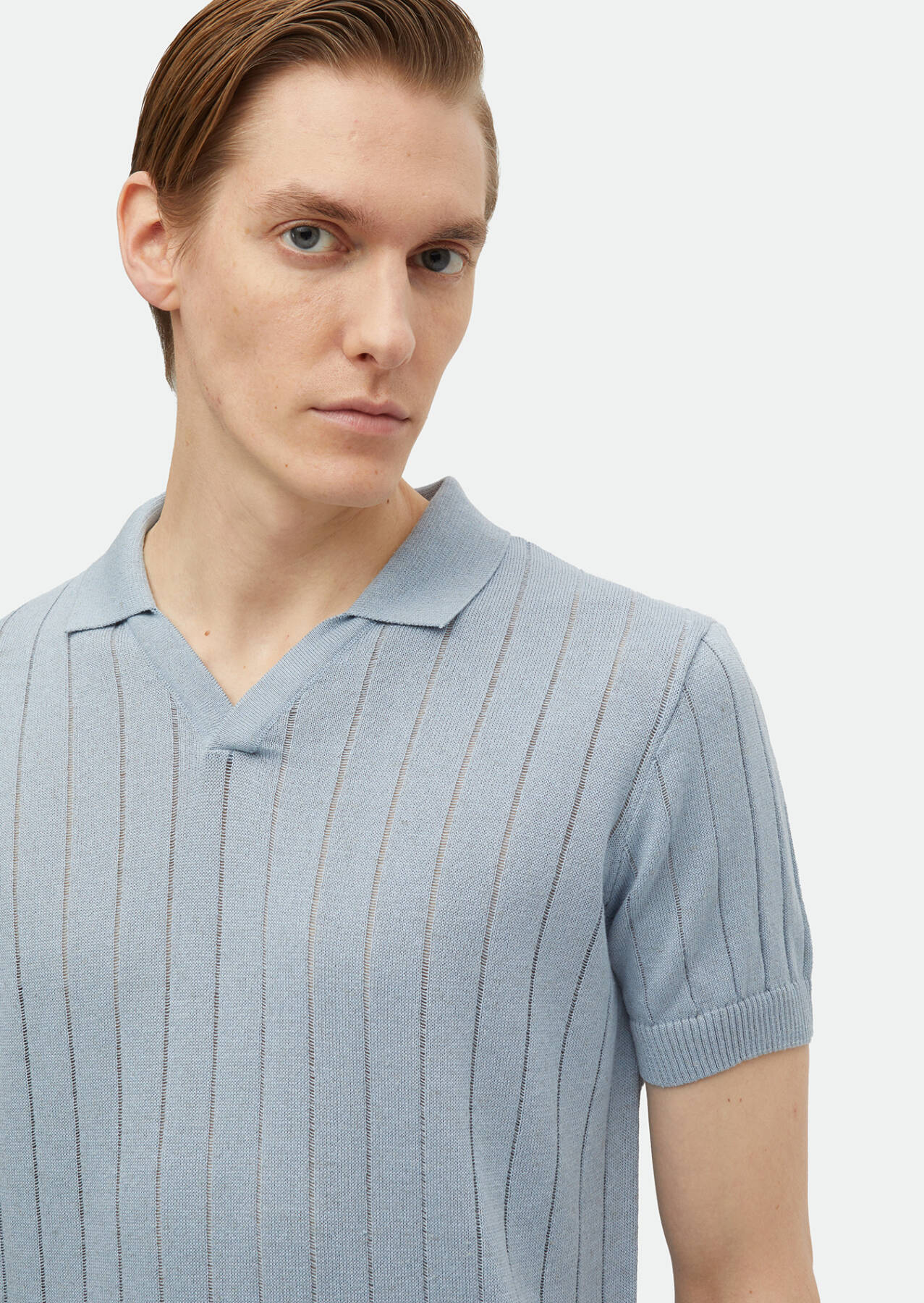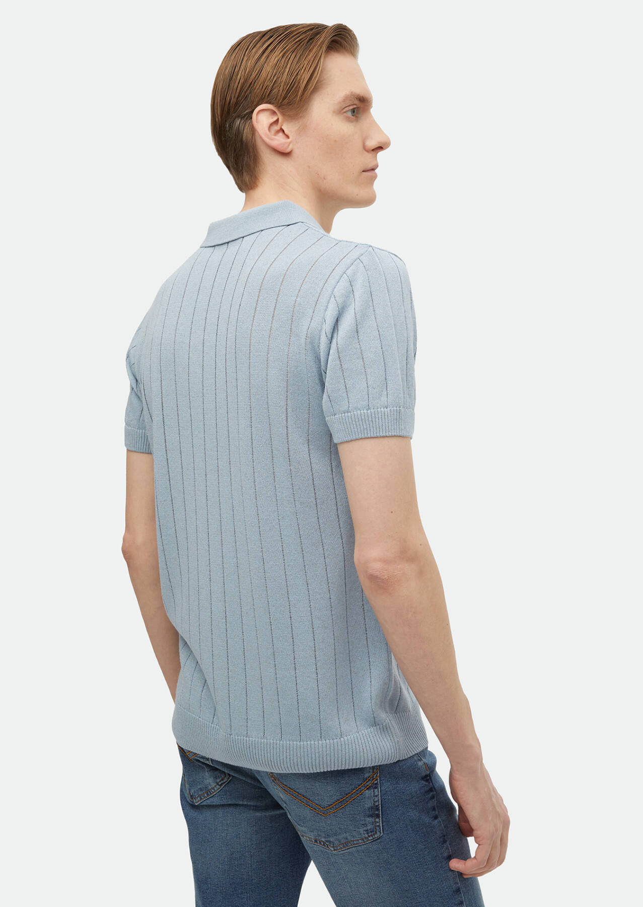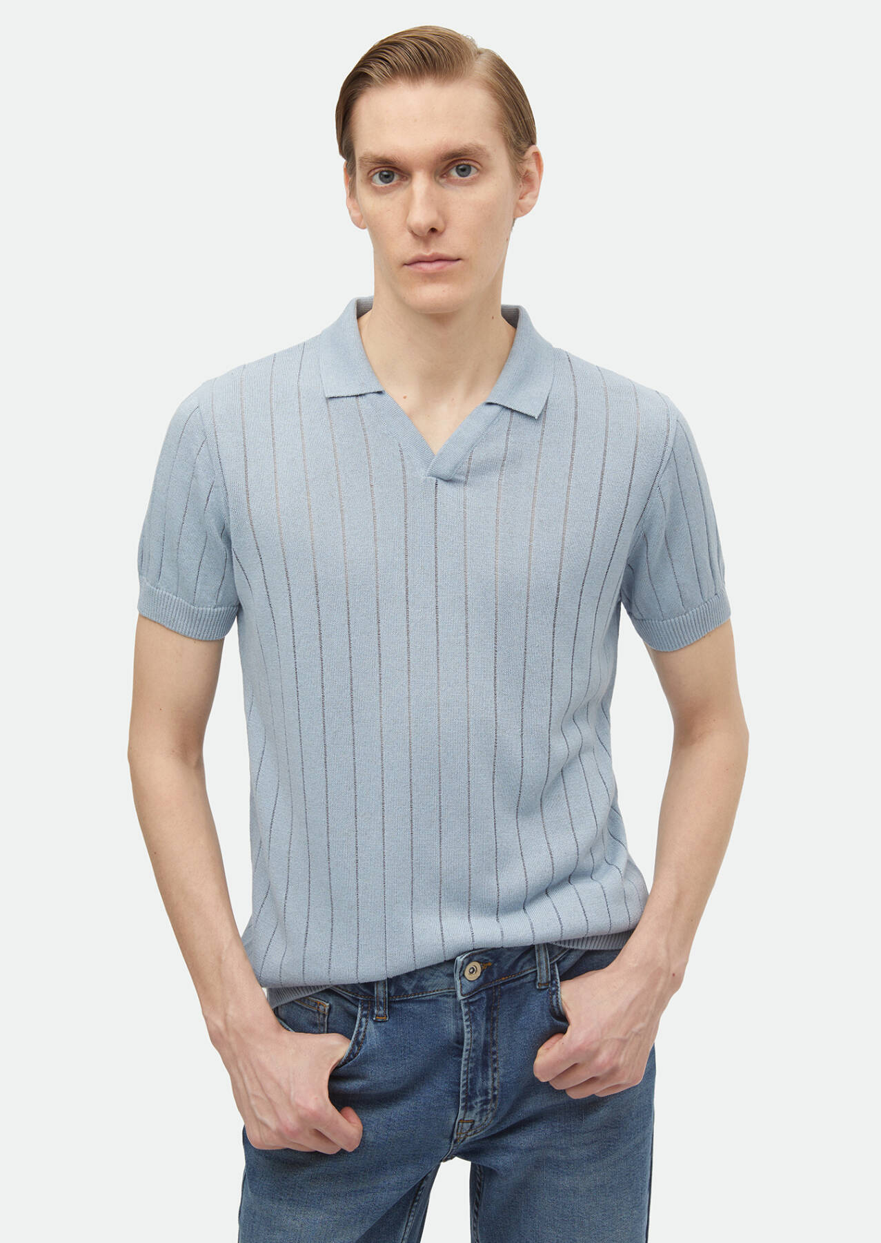 Mavi Polo Yaka Jakarlı Keten Karışımlı Triko
