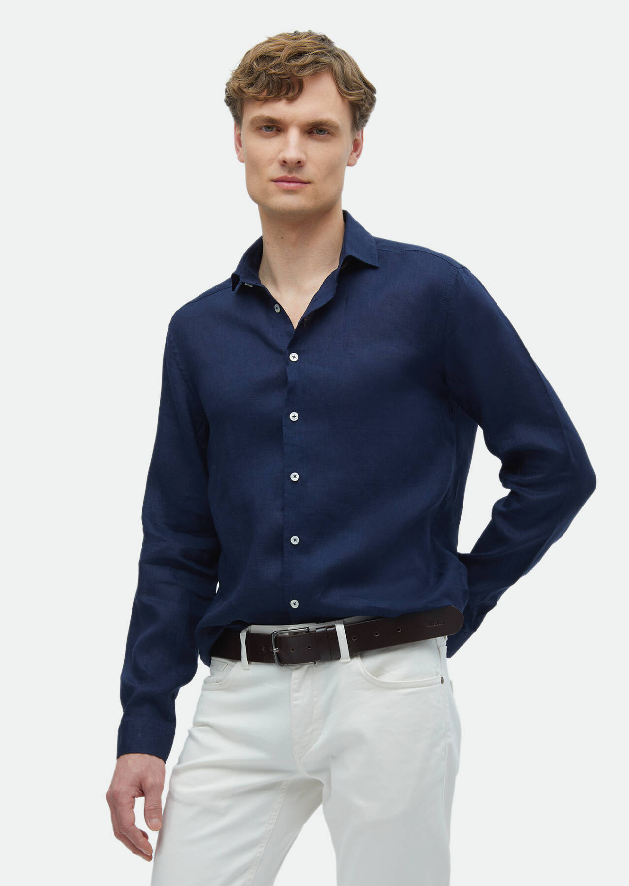 Navy Blue Plain Casual Fit Weaving Casual 100% Linen Shirt
