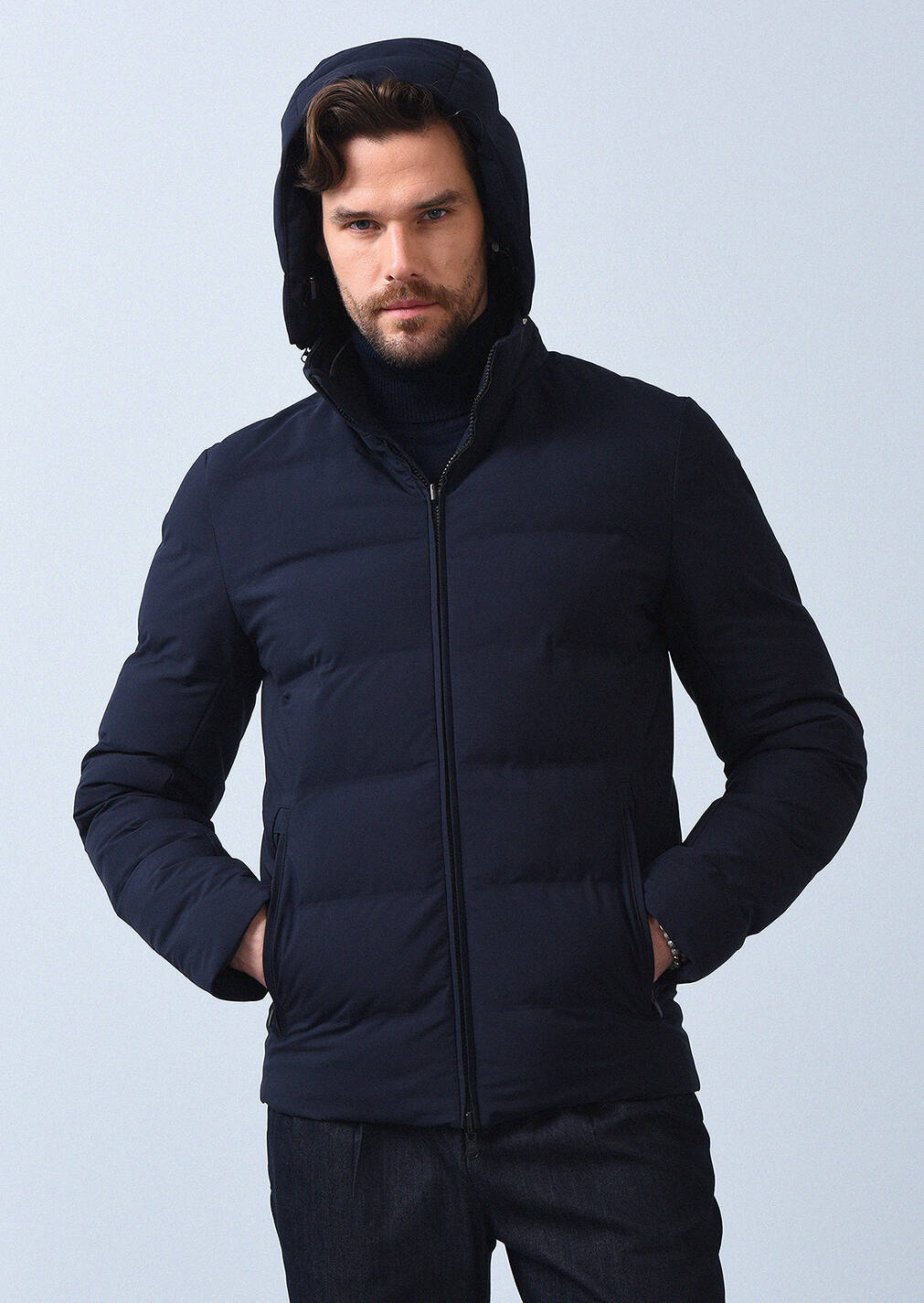 Navy Blue Regular Fit Turtleneck Denim Weaving Coat