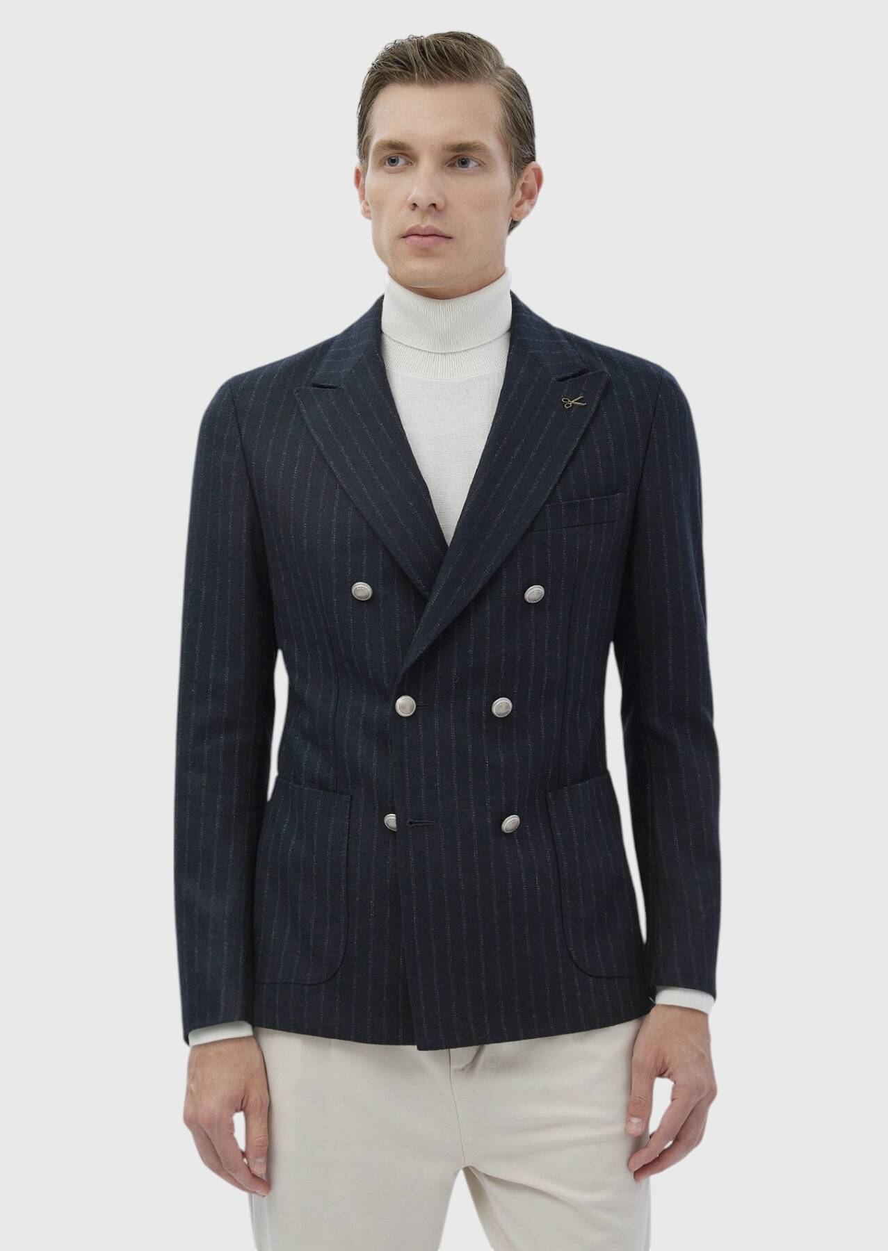 Navy Blue Striped Shirt Shoulder Slim Fit Wool Blended Jacket