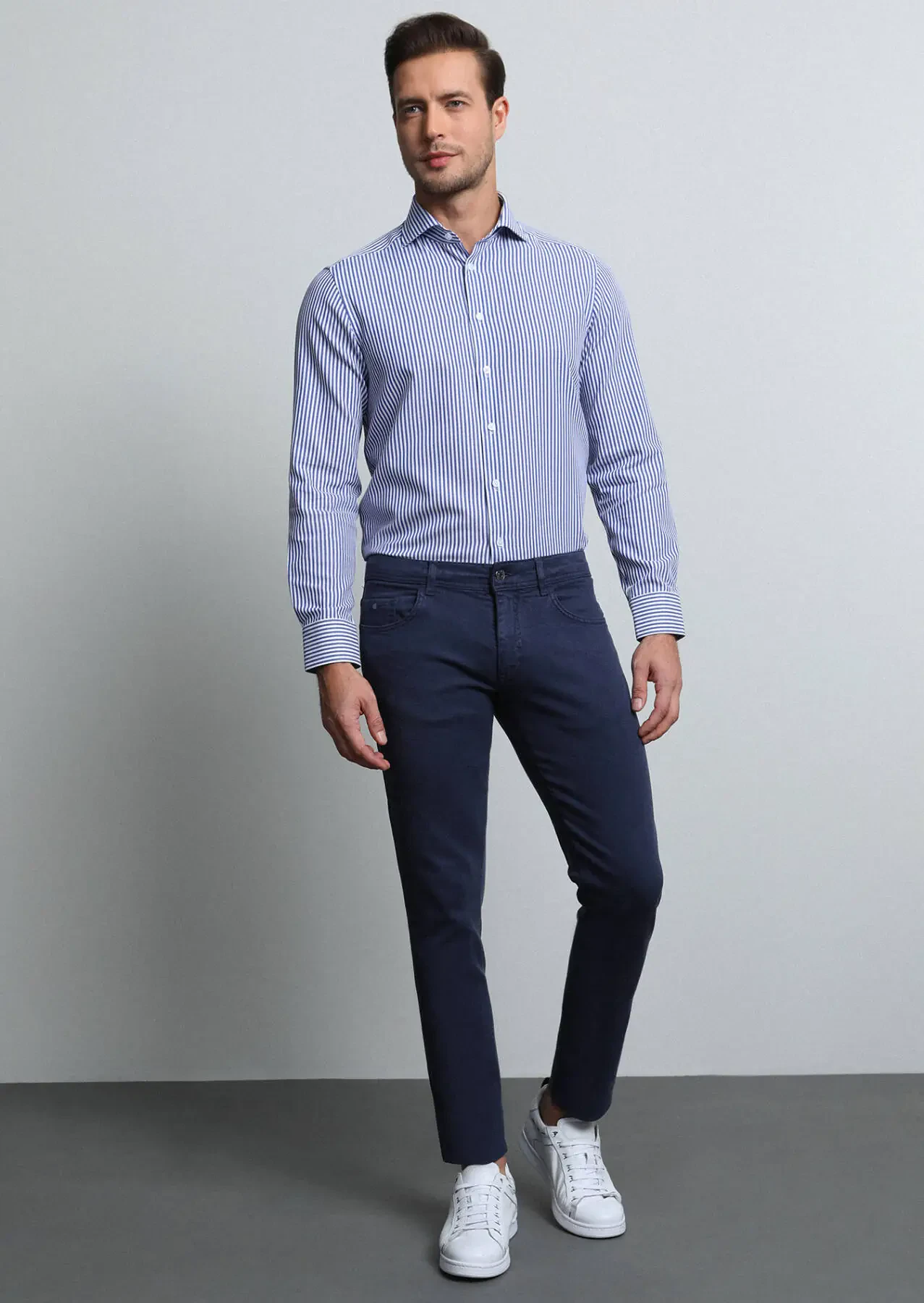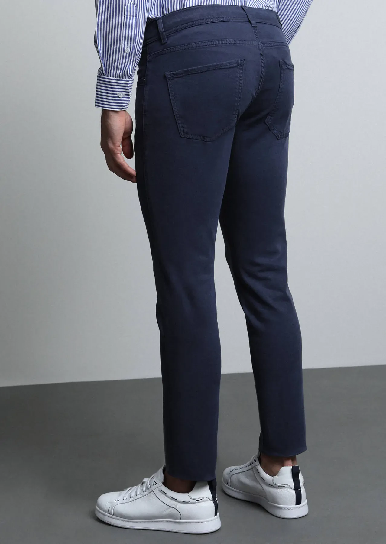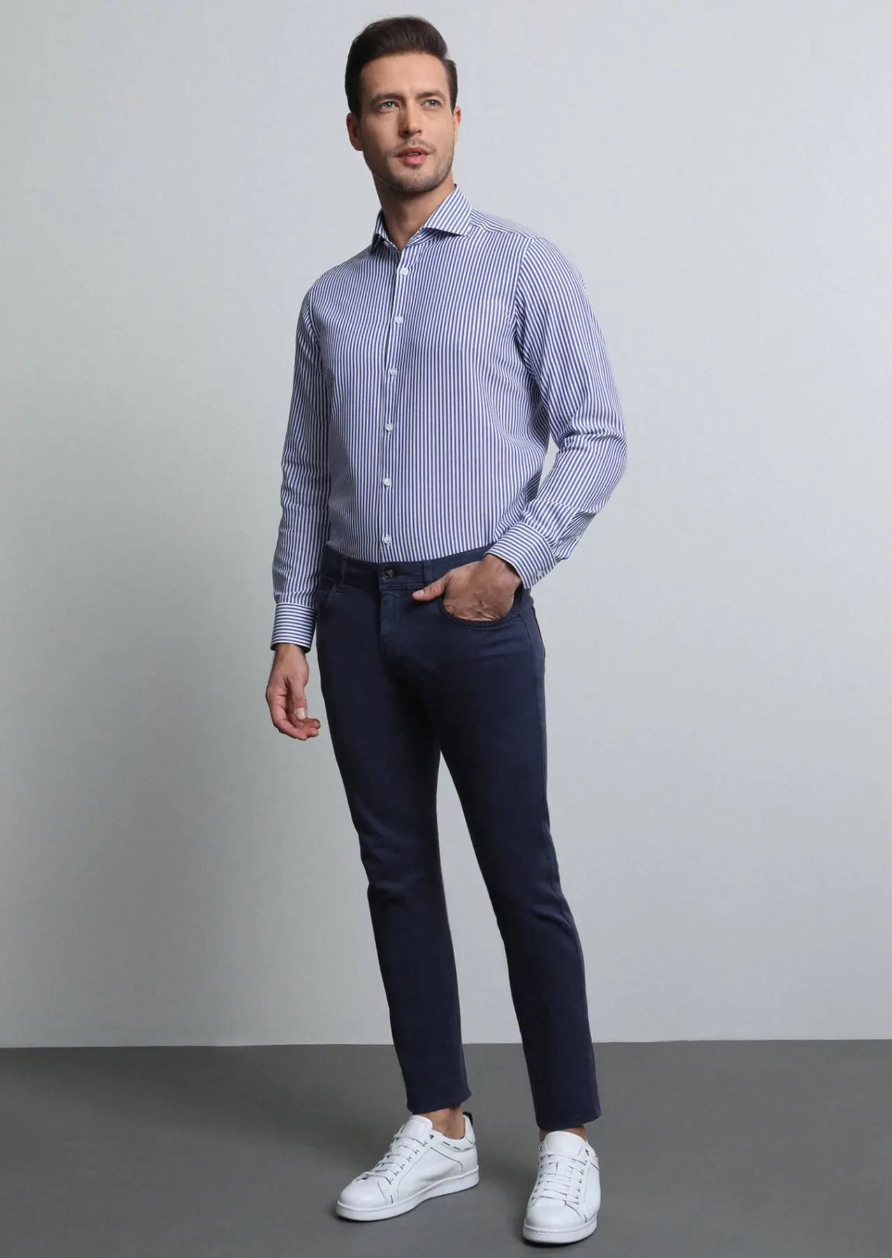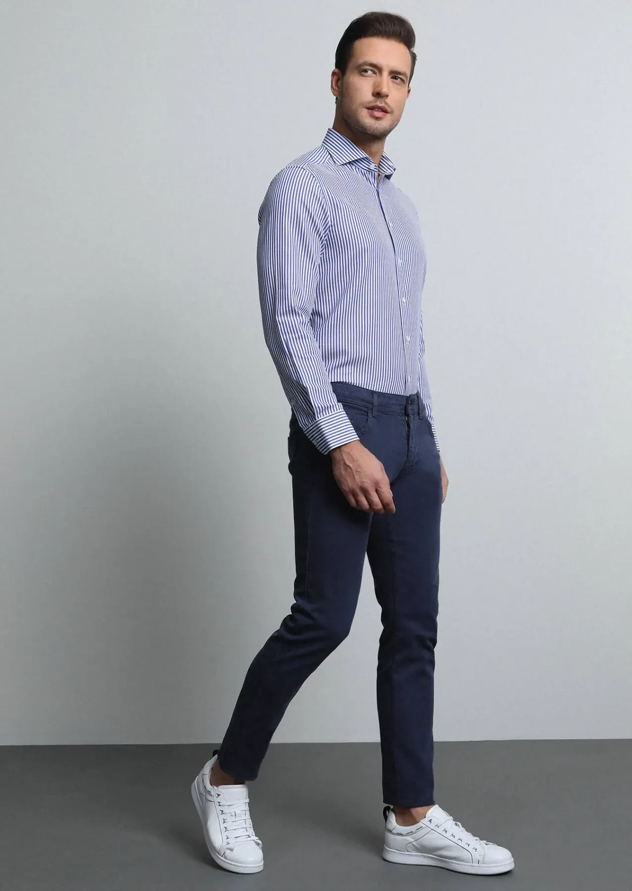 Navy Blue Weaving Slim Fit Casual Cotton Blended Trousers