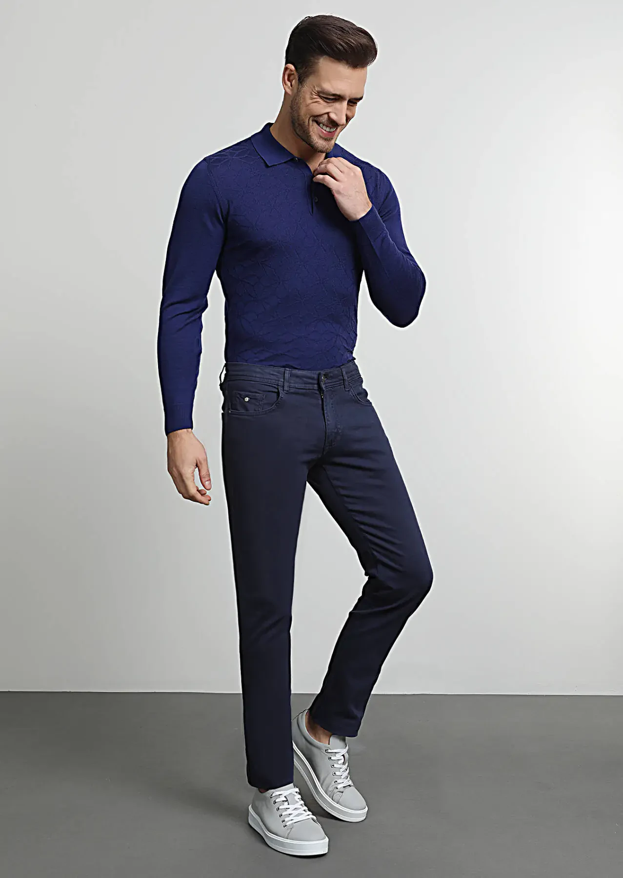 Navy Blue Weaving Slim Fit Casual Cotton Blended Trousers