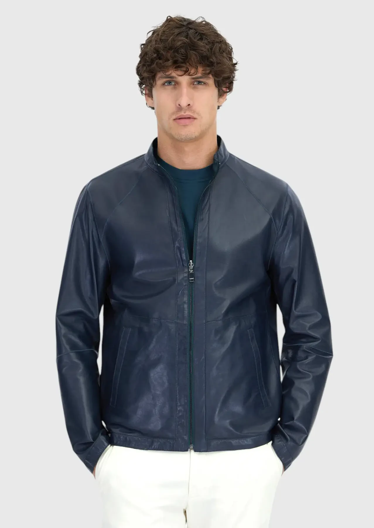 Petrol Blue Turtleneck Casual Double-Sided Leather Coat