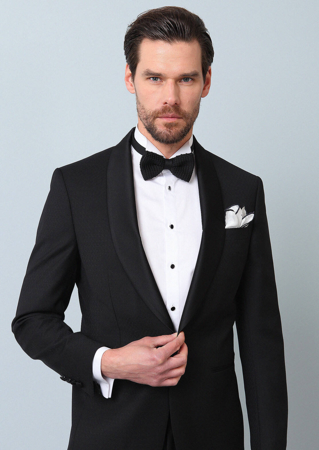 Siyah Desenli Modern Fit Şal Yaka Dokuma Smokin Takım Elbise