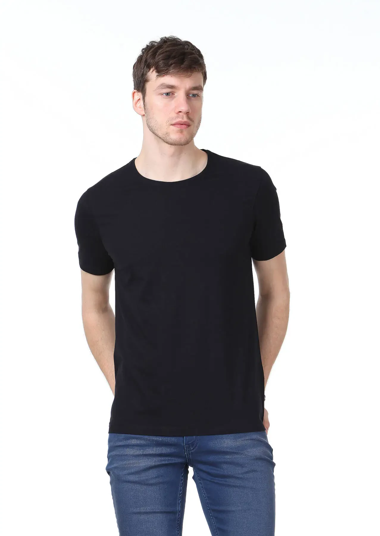 Siyah Düz Pamuk Karışımlı T-Shirt