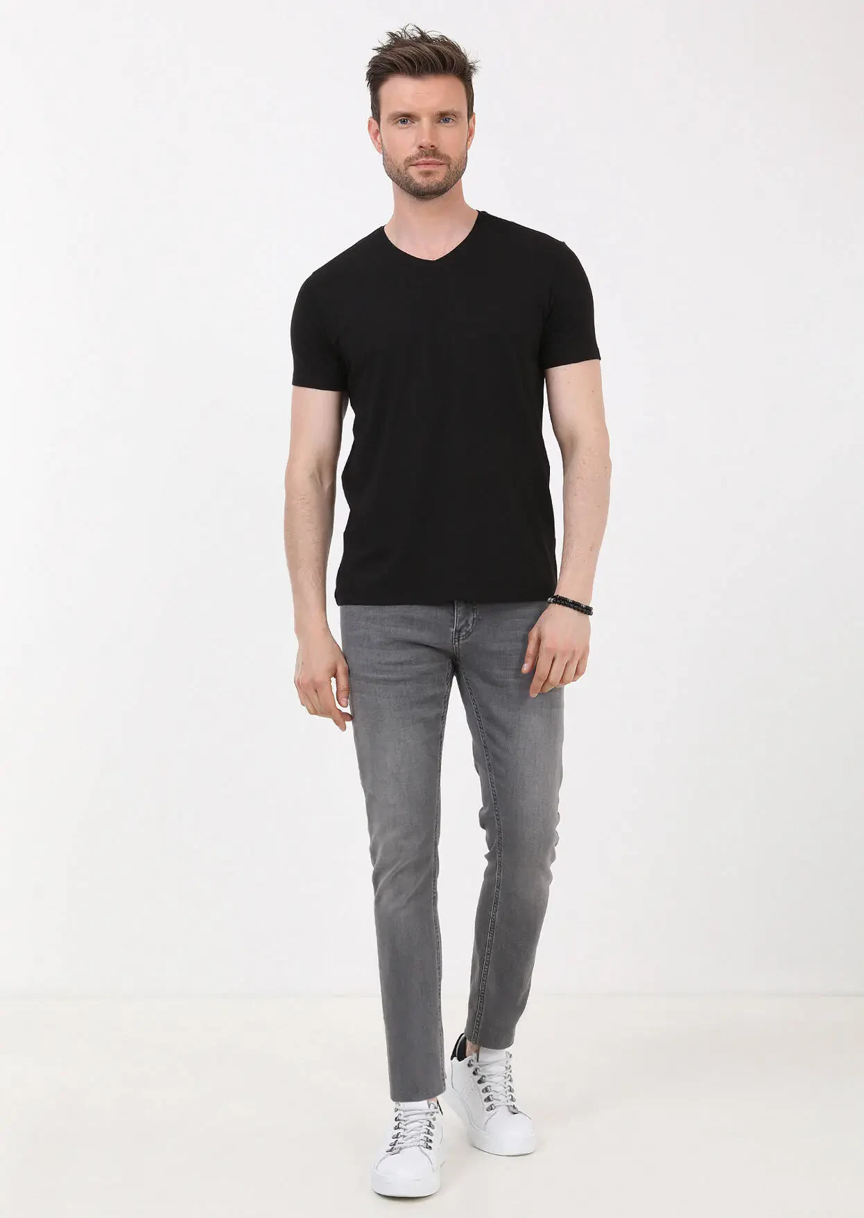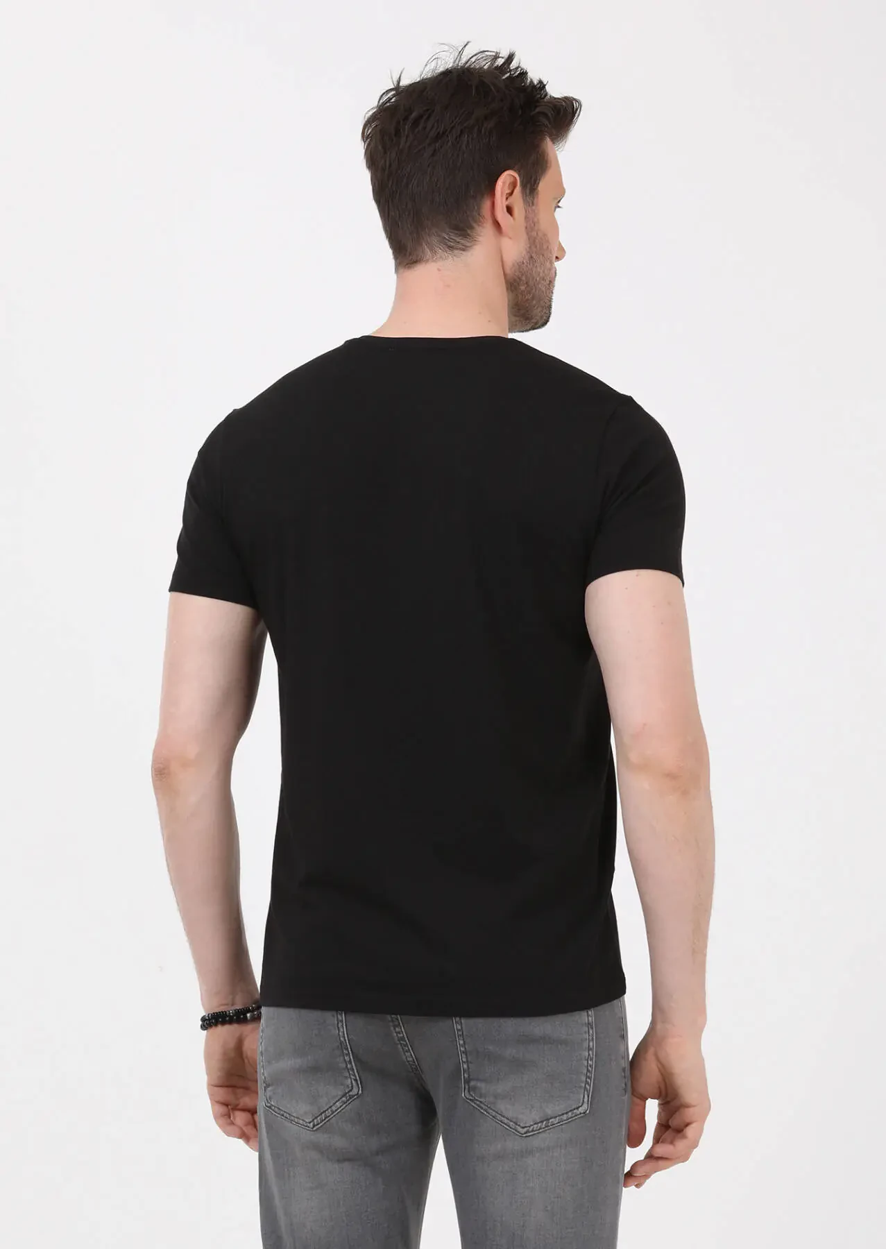 Siyah Düz V Yaka Pamuk Karışımlı T-Shirt