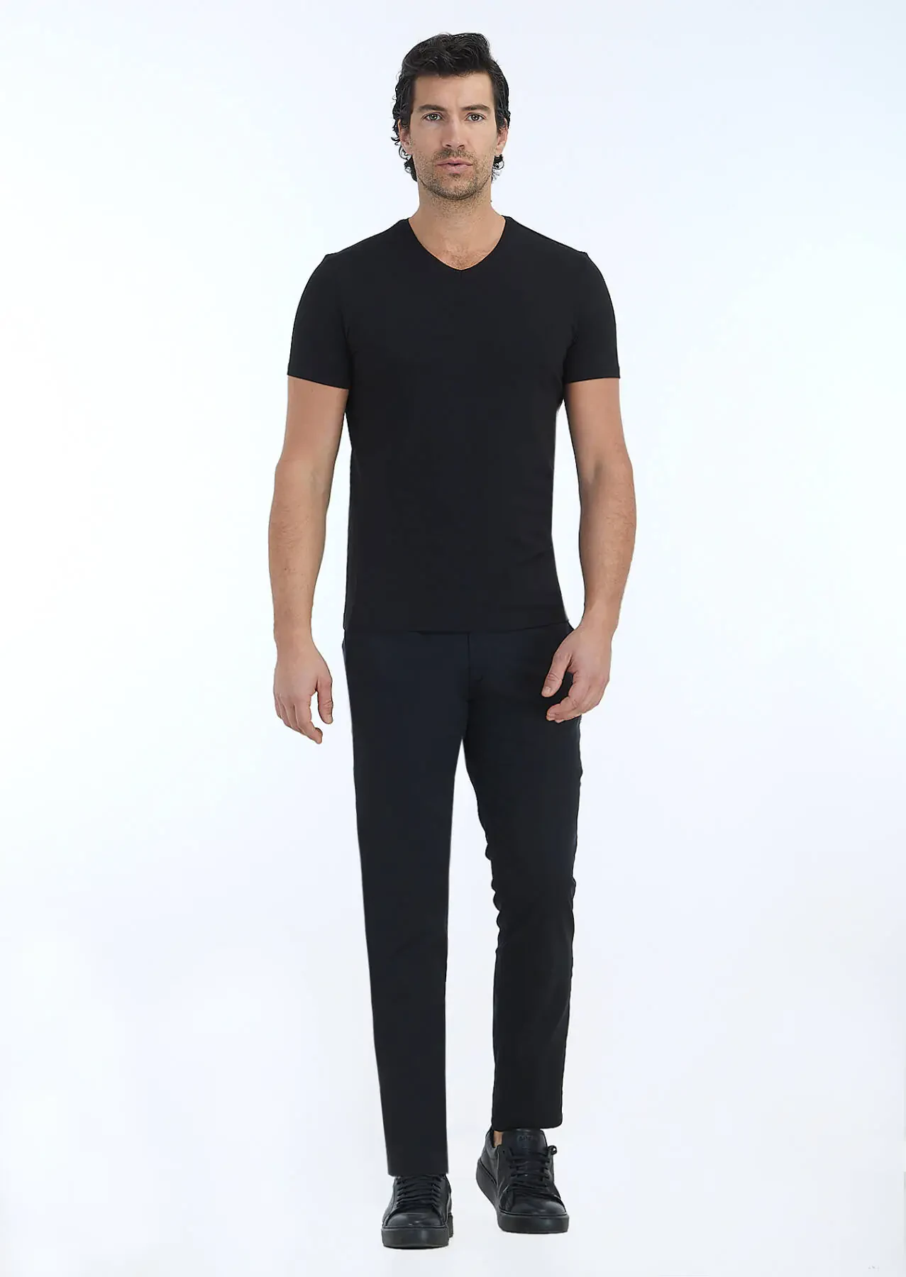 Siyah Düz V Yaka Pamuk Karışımlı T-Shirt