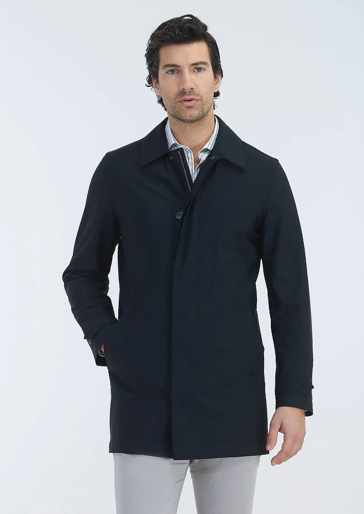 Siyah Regular Fit Gömlek Yaka Casual Dokuma Pardesü