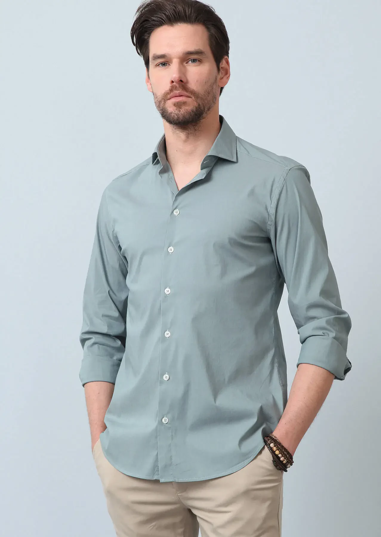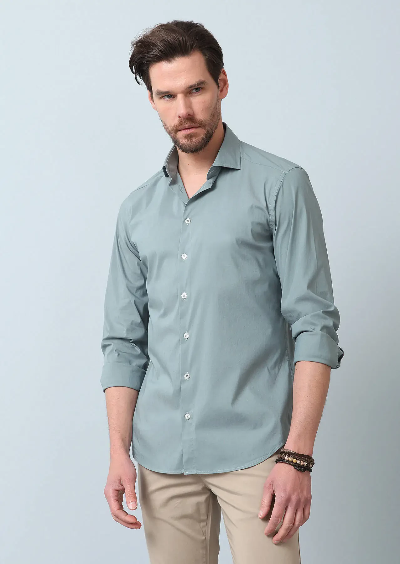Su Yeşili Düz Regular Fit Dokuma Casual Pamuk Karışımlı Gömlek