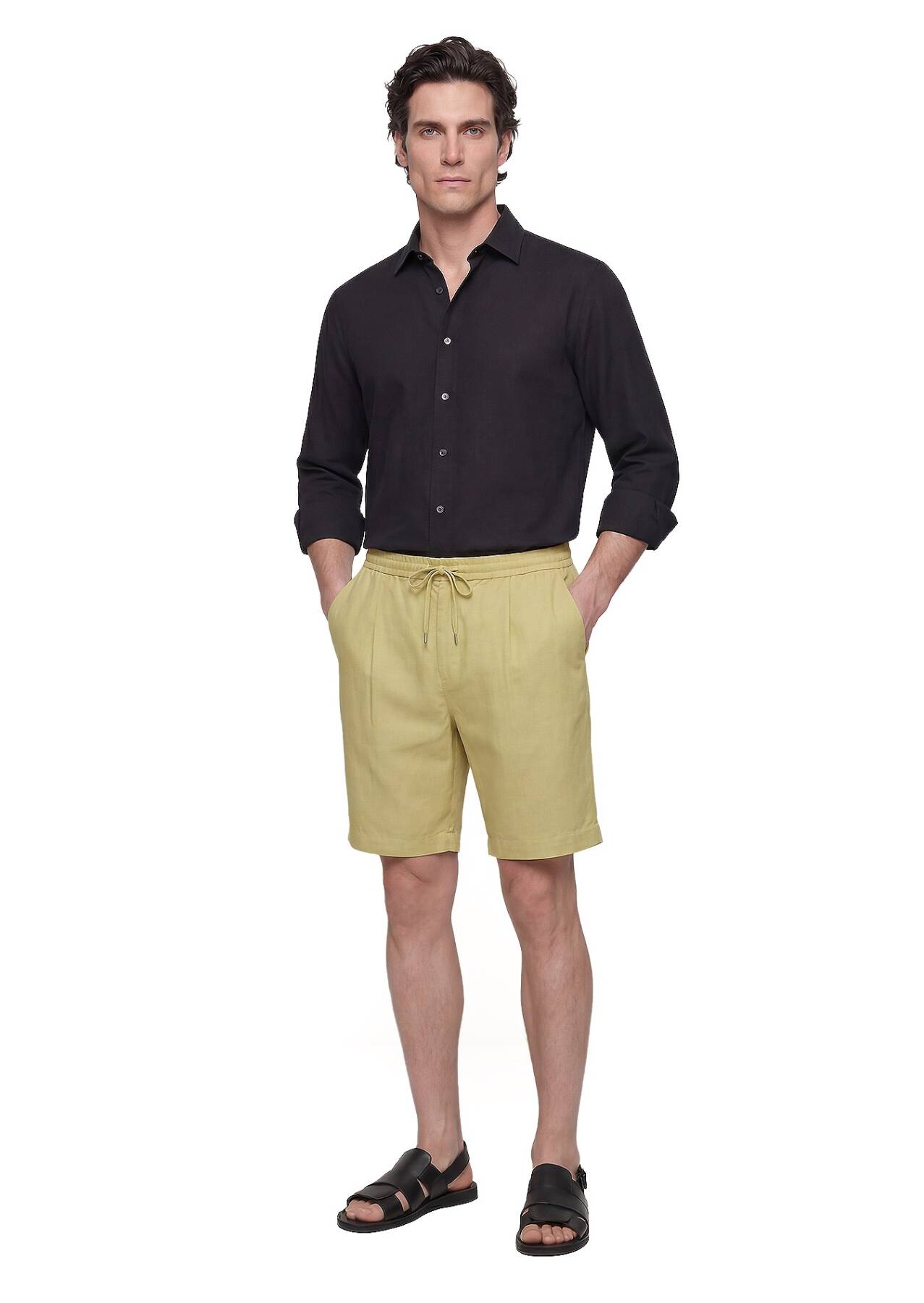 Yağ Yeşili Düz Dokuma Jogging Fit Casual Keten Karışımlı Bermuda